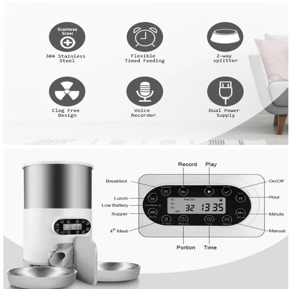 Программируемое время кормления-больше не просыпается домашними животными по утрам, не нужно беспокоиться о кормлении домашних животных, когда выходите! Автоматические кормушки для кошек могут обеспечить своевременное и количественное питание для ваших питомцев, 1-4-разовое питание в день, 1-4 0 порций в еде (5 мг в порции). Начните настраивать здоровую диету для ваших кошек и собак прямо сейчас!2-сторонний разветвитель & 304 Нержавеющая сталь тела-идеально подходит для мульти-питомец семьи. Этот Фидер для кошек 4,5л оснащен двухполосными разветвителями, перегородками, противозасорением конструкции, которые обеспечивают равномерное распределение между 2 чашами. Контейнер для хранения домашних животных и 2 миски изготовлены из нержавеющей стали 304, что обеспечивает более здоровую и гигиеническую еду для ваших питомцев.Двойная конструкция источника питания-даже если отключение питания, не беспокойтесь о том, что пищевой диспенсер для кошек не поставляет еду. Этот автоматический питатель для кошек питается от адаптера постоянного тока 5 В и/или батарей. Даже если питание питателя ПЭТ отключено, 3 Щелочные d-типа батареи будут держать оборудование в рабочем состоянии. Кроме того, он оснащен настройкой памяти, вам не нужно сбрасывать параметры после выключения питания.Диктофон 10s-вы можете позвонить своему питомцу перед едой! Нажмите кнопку «Mic» для автоматической подачи кошек, чтобы записывать голос 10s, регулярно вызывая вашего питомца, и пусть ваш голос будет сопровождать их каждый прием пищи. Вы также можете отменить запись, до еды не будет воспроизводиться голос.Простота и удобство в эксплуатации-простая установка/разборка + четкое Программирование позволяют начать работу за 5 минут. Легко моется и поддерживает посудомоечную машину-304 материал из нержавеющей стали прост в очистке, поддерживает автоматическая кормушка для кошки контейнеры для хранения пищи и 2 миски были вымыты в посудомоечной машине. (Примечание: Основной блок с дисплеем нельзя мыть)