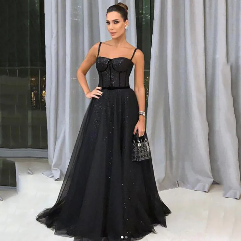Простое блестящее черное ТРАПЕЦИЕВИДНОЕ длинное вечернее платье с блестками 2022 на тонких бретелях корсет с сердечком вечерние платья для вечеринки выпускного вечера