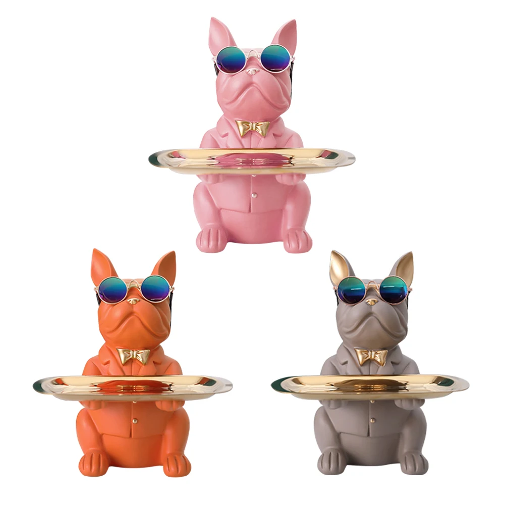 Креативный поднос для скульптуры бульдога, стеллаж для хранения косметики, скульптура из смолы, ремесло, украшение для дома, художественное украшение, настольный декоративный