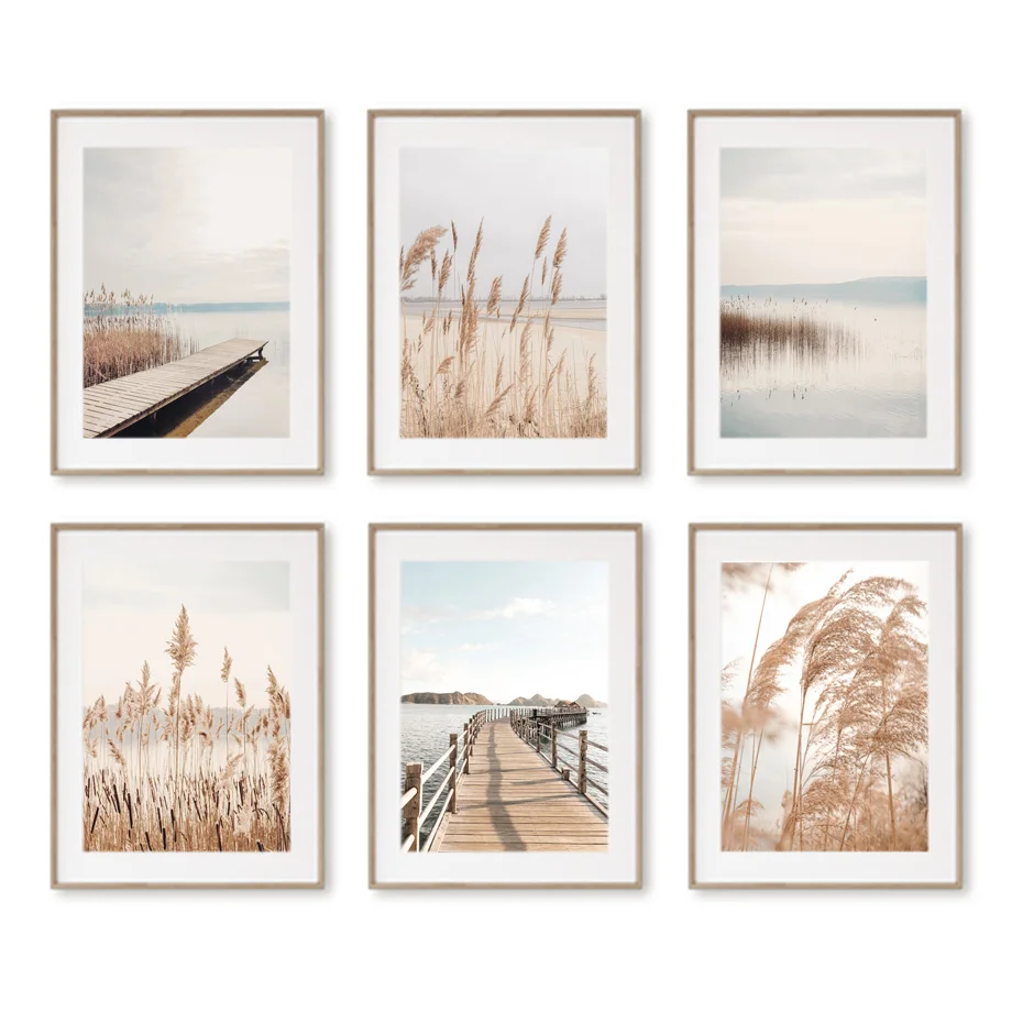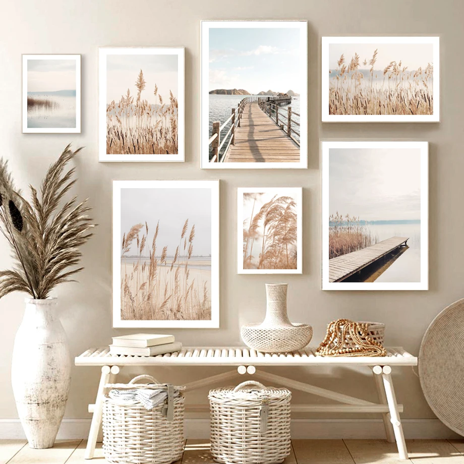 Настенная картина с изображением бежевого озера, деревянного моста, осеннего пейзажа, постеры и принты в скандинавском стиле для украшения интерьера гостиной