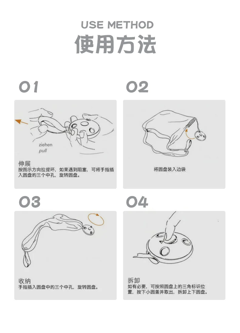 Шаг 1: растяните, вытяните кольцо в направлении, показанном на странице деталей, если вы столкнулись с блокировкой, Вставьте пальцы в три отверстия диска и поверните дискШаг 2: Поместите диск в боковой карманТретий шаг: хранение, вставьте среднее отверстие диска в руку и поверните диск.Шаг 4: разборка. При необходимости нажмите на маленькую круглую крышку и выньте ее в соответствии с треугольником на диске, чтобы разобрать верхний и нижний диски.