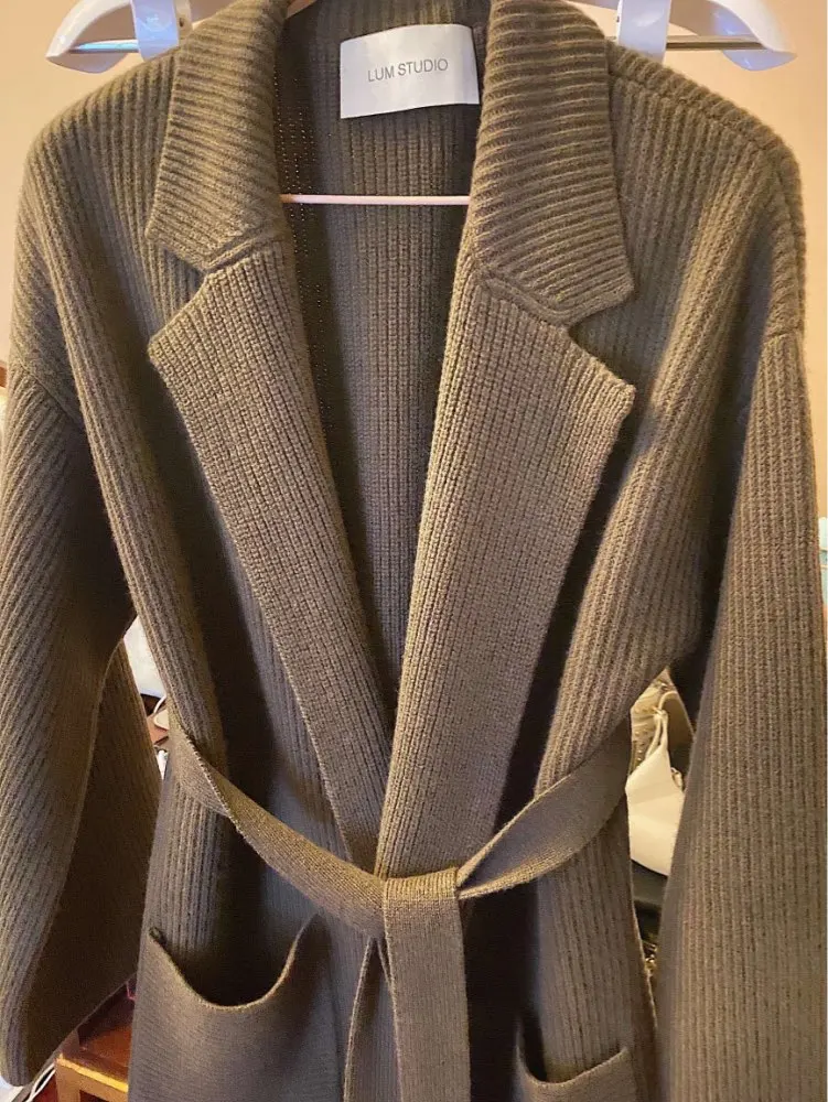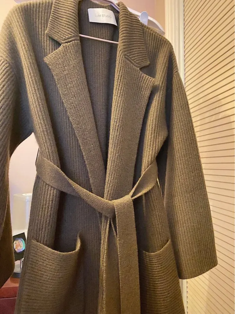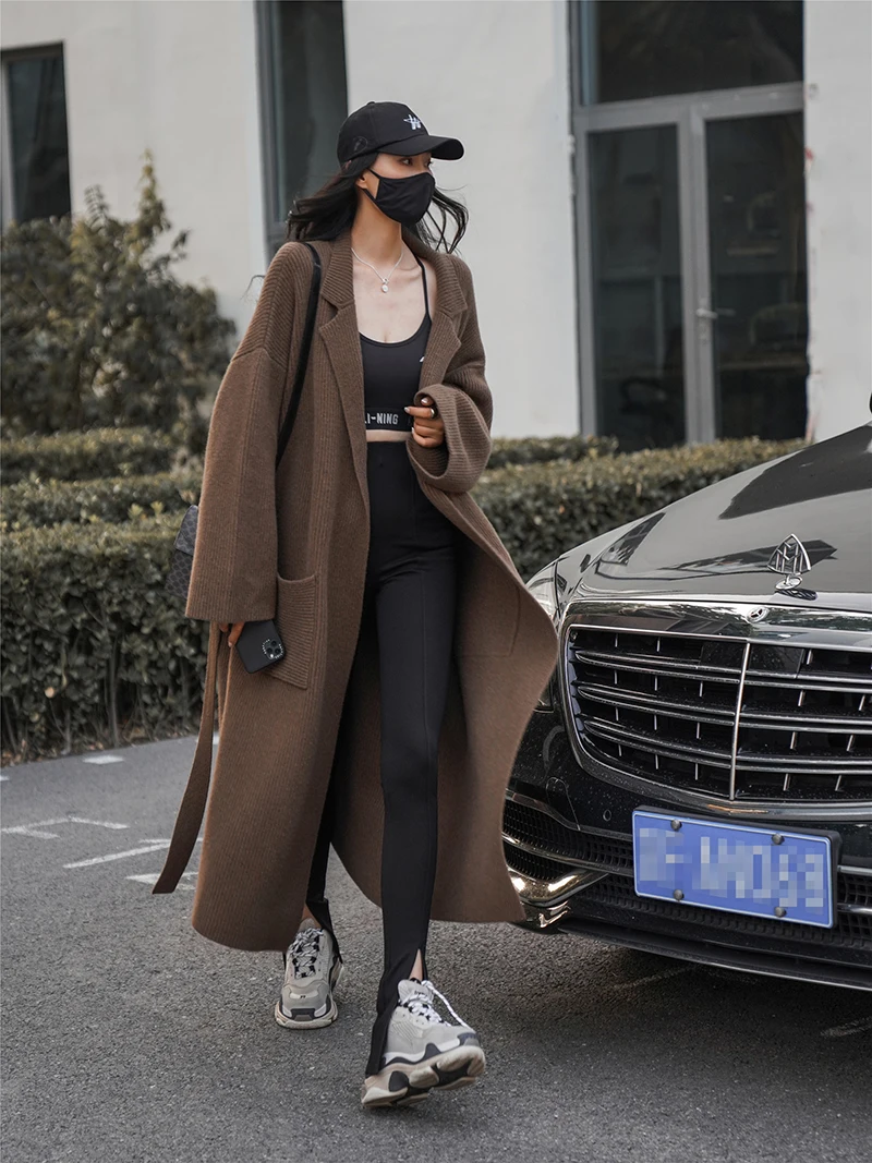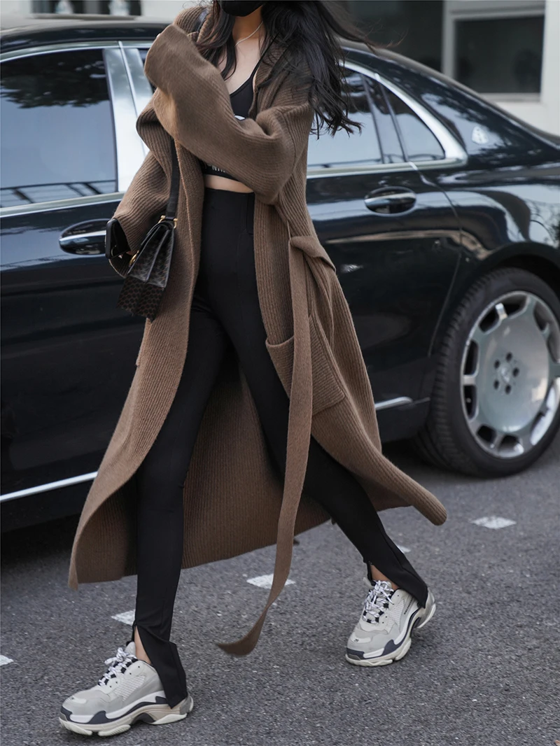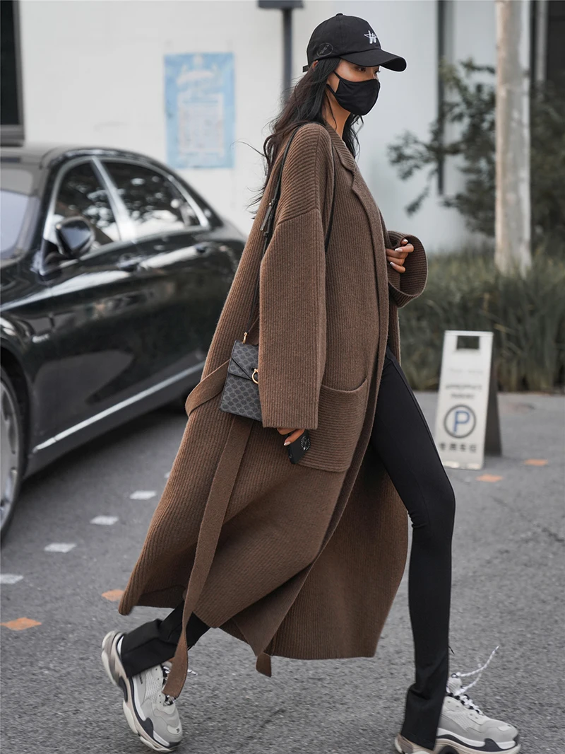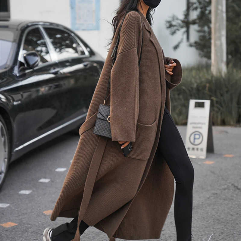 Осень 2021 женская одежда свитер женский кардиган оверсайз однотонный коричневый пояс зимний женский свитер с отложным воротником пальто для женщин