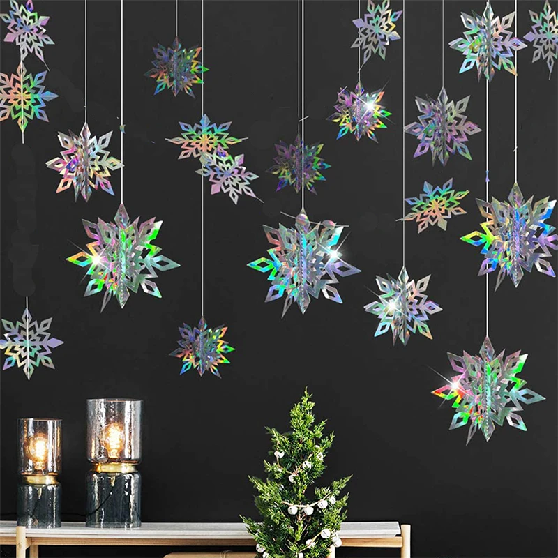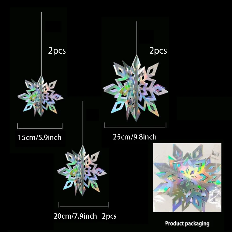 Название: трехмерный полый Снежинка комплект из шести предметовМатериал: цветной картон с радужной пленкойРазмер: 25 см/20 см/15 см в диаметре, по два, каждая Снежинка висит линия около 20 см в длинуНазначение: Зимние вечерние наряды, украшения для дома на Рождество и новый год