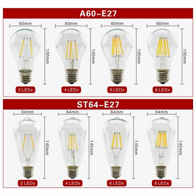 1 светодиодный Филамент = 1 Вт, не 2 Вт. 2 светодиодный накаливания = 2 Вт = 20 Вт лампа накаливания = 8 Вт лампа CFL 4 светодиодный накаливания = 4 Вт = 40 Вт лампа накаливания = 15 Вт лампа CFL 6 светодиодный накаливания = 6 Вт = 60 Вт лампа накаливания = 25 Вт лампа CFL 8 светодиодный накаливания = 8 Вт = 80 Вт лампа накаливания = 40 Вт лампа CFL