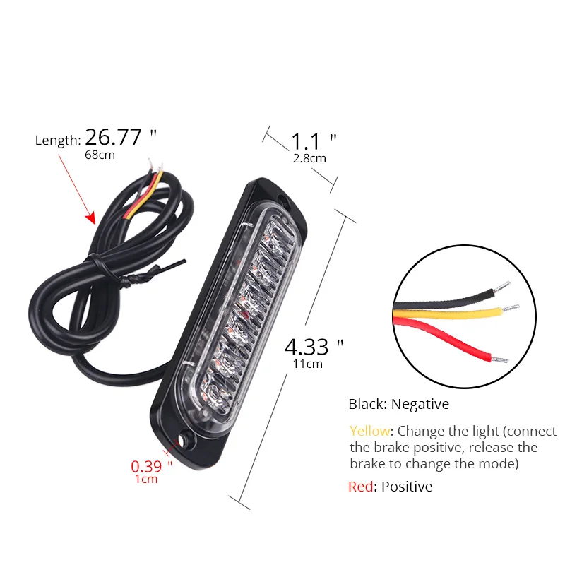 Название продукта: 6 светодиодный предупреждающий светильник стробоскоп светильник боковой светильник дневной ходовой светильник указатель поворотаПрименимые модели: общего назначения (автомобили, грузовики, грузовики, мотоциклы и т. д.)Рабочее напряжение: 12V-24VМесто установки: универсальностьМощность: 18 ВтВодонепроницаемость: IPX-4Срок службы продукта> = 50000 часовФункция продукта: функция памятиРабочий ток: 1AЦвет: красный, желтый, белыйСпособ подключения: три линии. Черный-это отрицательный полюс, красный-положительный полюс. Желтый-это переменный светильник (Возьмите положительный полюс, а затем ослабьте его, измените вариант)