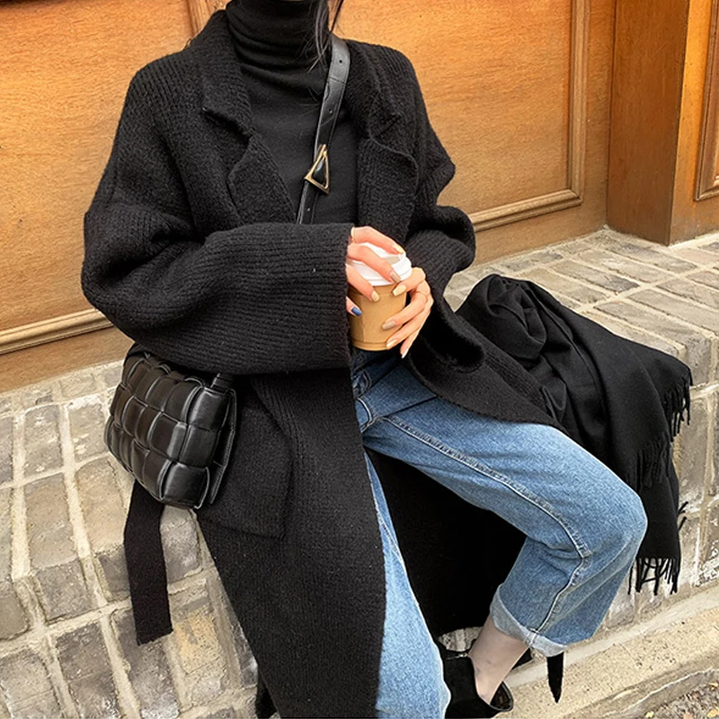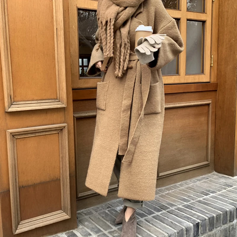 Зимний Кардиган, длинный Модный корейский Кардиган, Свитер, Женский винтажный кардиган на шнуровке, плотный вязаный свитер большого размера, пальто