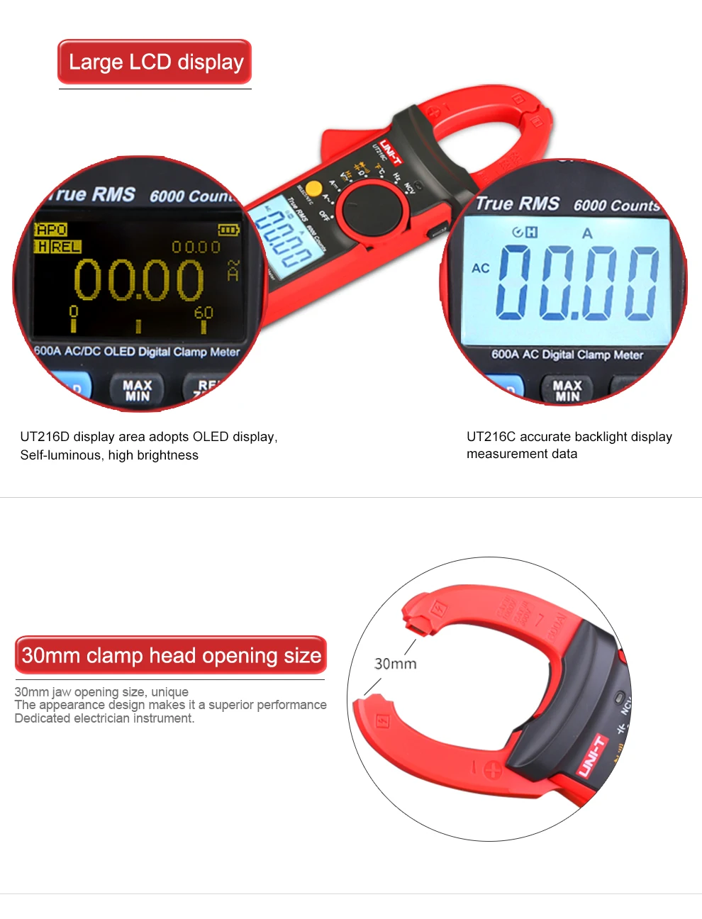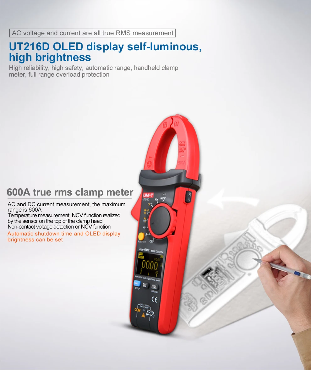 UNI-T UT216C 600A цифровые клещи переменного тока постоянного тока Автоматический диапазон мультиметров NCV v.f. C диодный ЖК-Фонарик тестер температуры