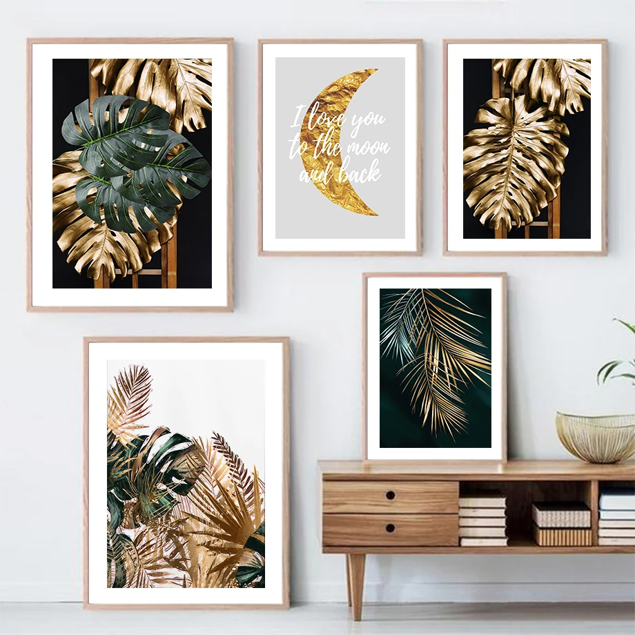 Абстрактная Настенная картина с изображением золотых растений, листьев монстеры, Луны, скандинавские постеры и искусства на холсте для декора гостиной