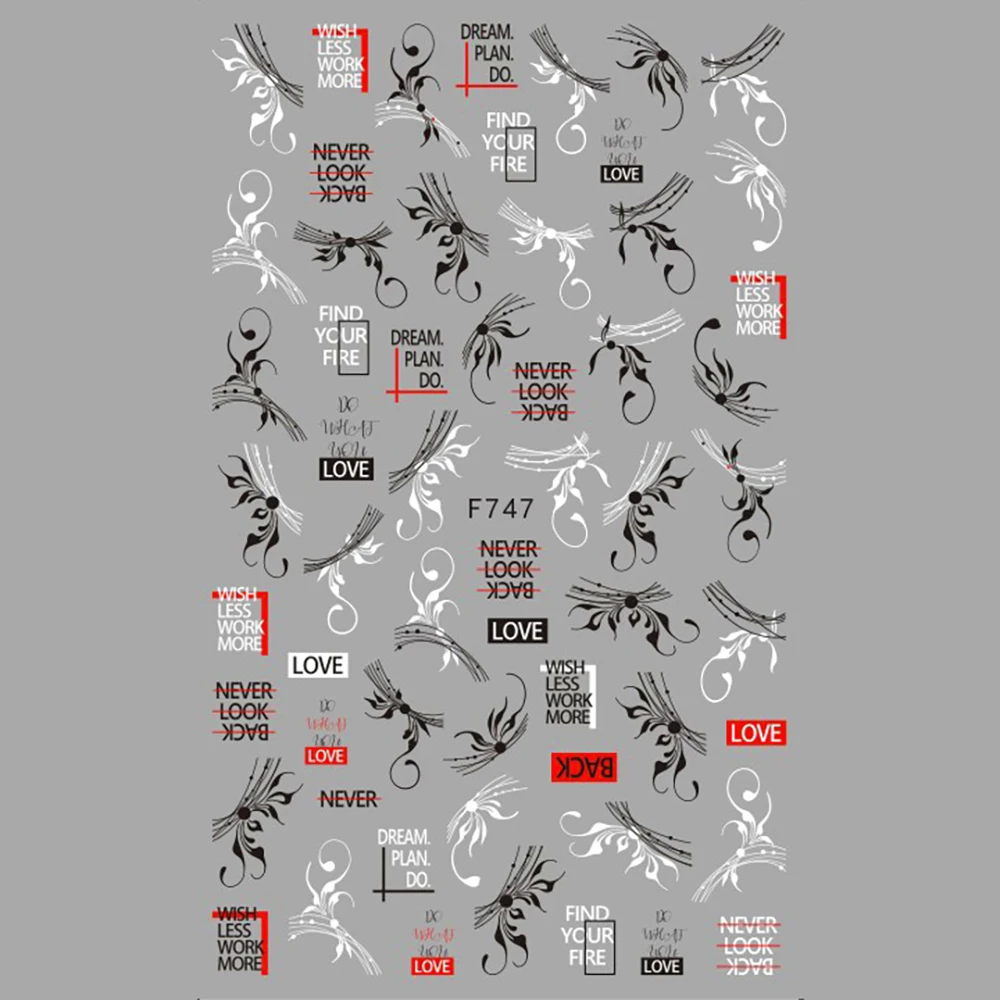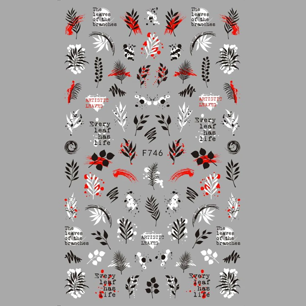 Наклейки для дизайна ногтей 50 шт., черные и белые листья, буквы ал...