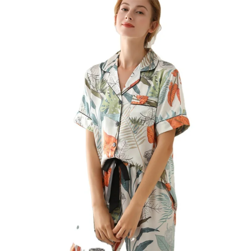 Пижама женская атласная, с коротким рукавом и принтом листьев