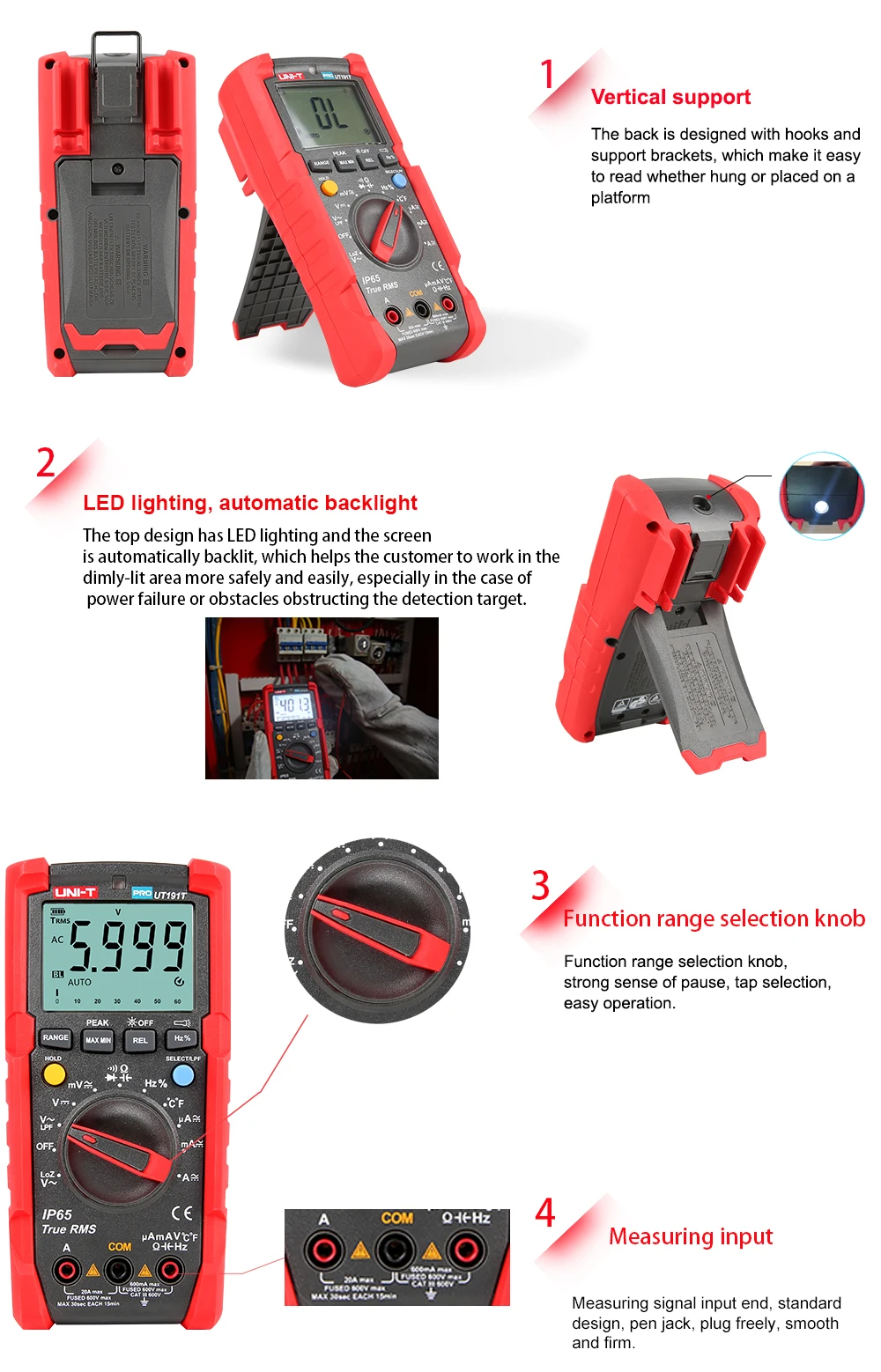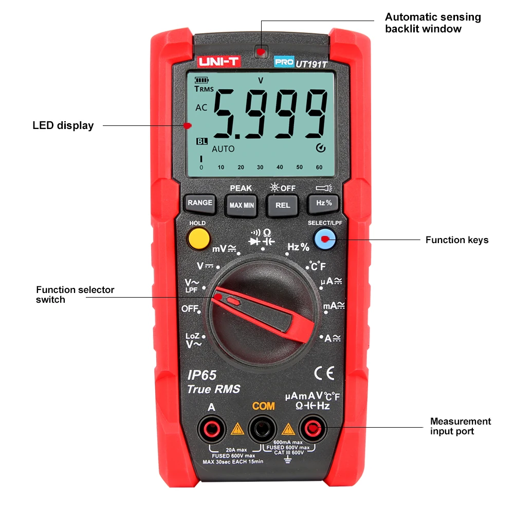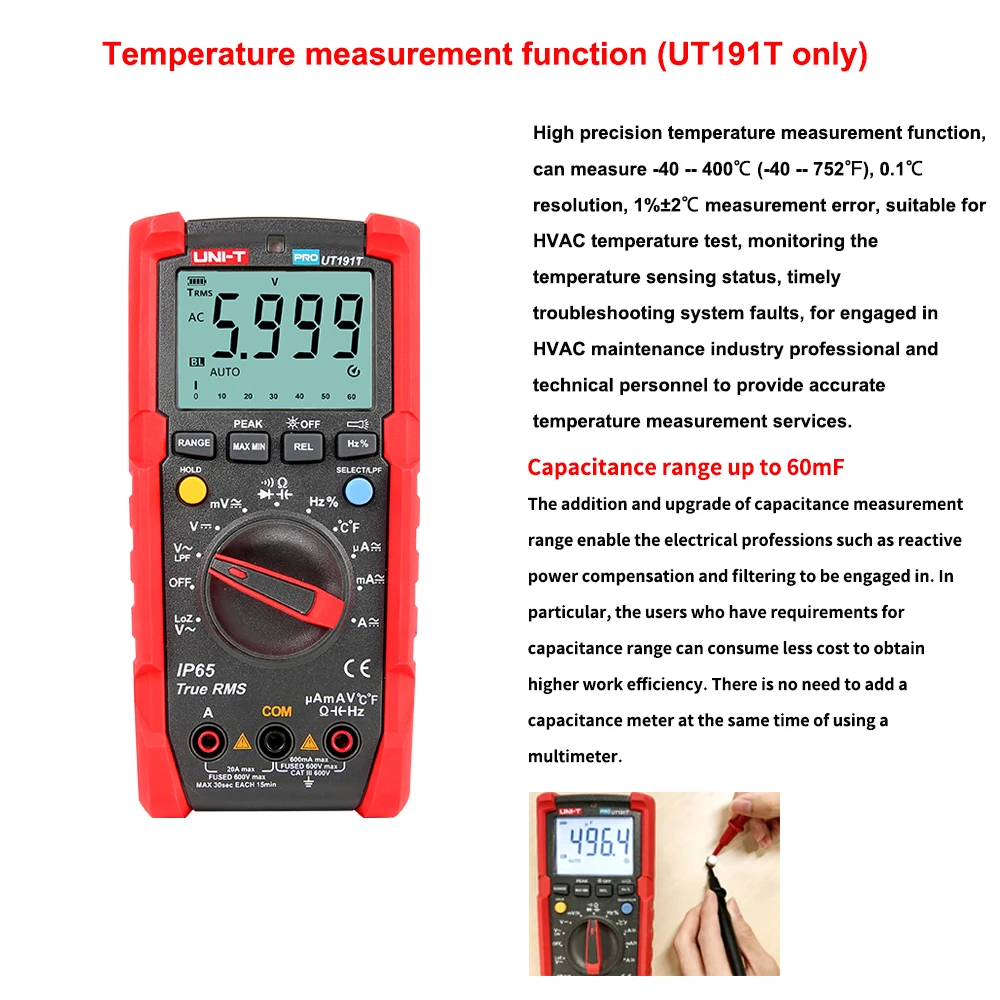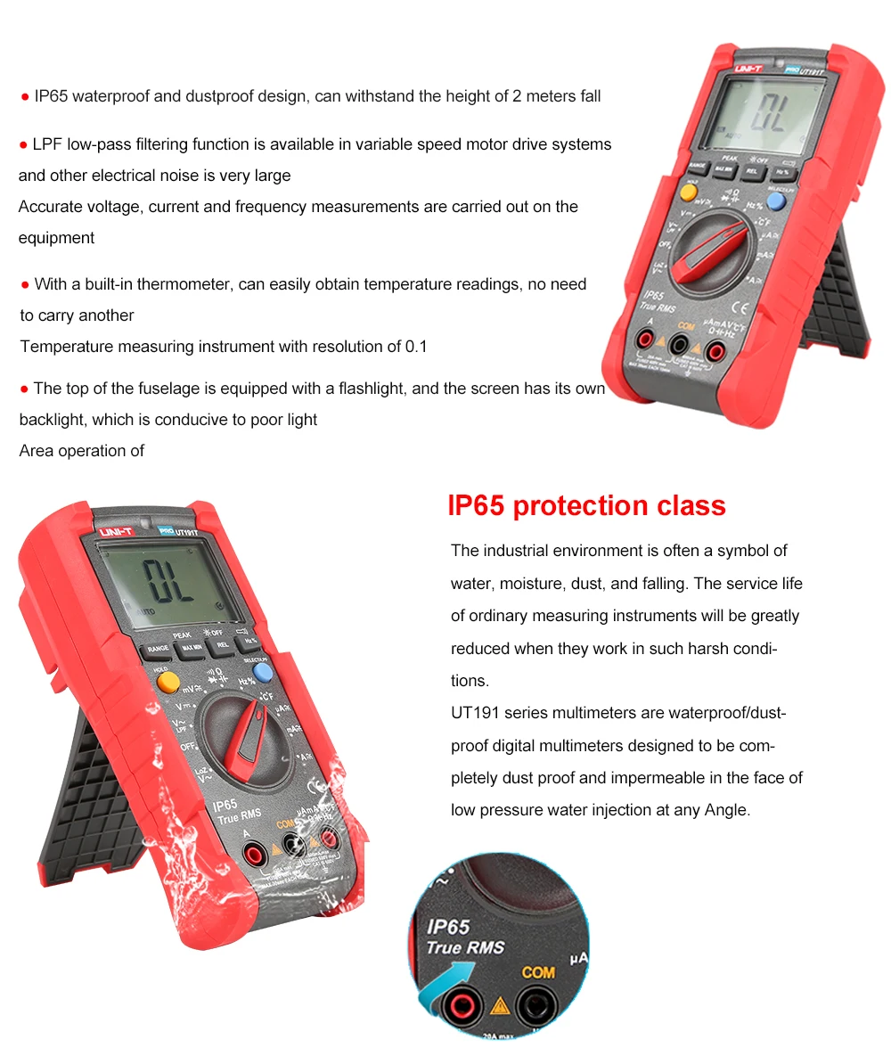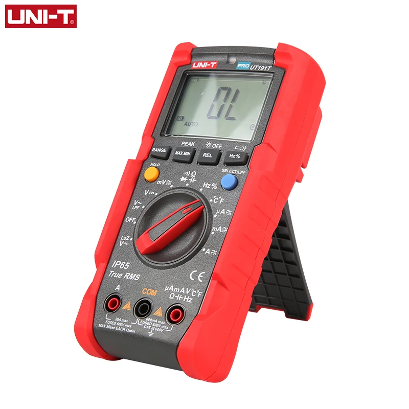 UT191 серия профессиональных мультиметров предназначена для промышленных пользователей. Этот сертифицированный мультиметр серии CE/GS/cTUVus соответствует стандарту CAT III 600V и имеет класс IP65, подходит для использования во влажной и пыльной среде. UT191's new function Memory сохраняет последние настройки режима в следующий раз, когда он включен, улучшая эффективность для пользователей. UT191T поддерживает точные и точные измерения температуры.