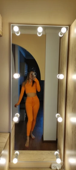 Брала размер S качество бомба,топ отлично сел,кофта тоже,лосины классные,один только минус,немножко просвещаются как на фото,если бы не просвещались , ткань была бы плотнее то цены ему б не было)))а так все отлично.