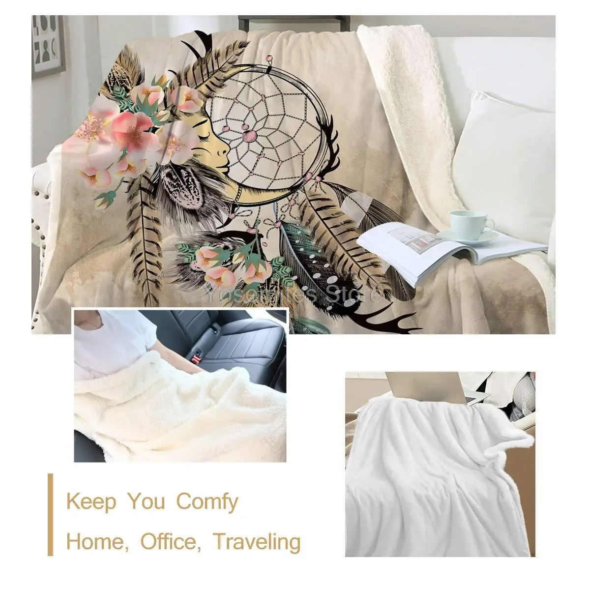 Флисовое одеяло в богемном стиле из шерпы, винтажный Ловец снов с Луной и розовыми перьями, кушетка с оригинальным принтом, диван-кровать