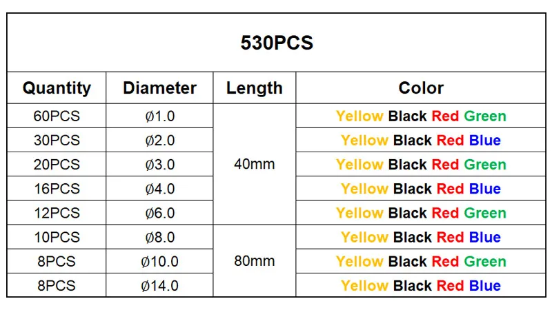 8pcsx10.0x80 мм (желтый, черный, красный, зеленый)