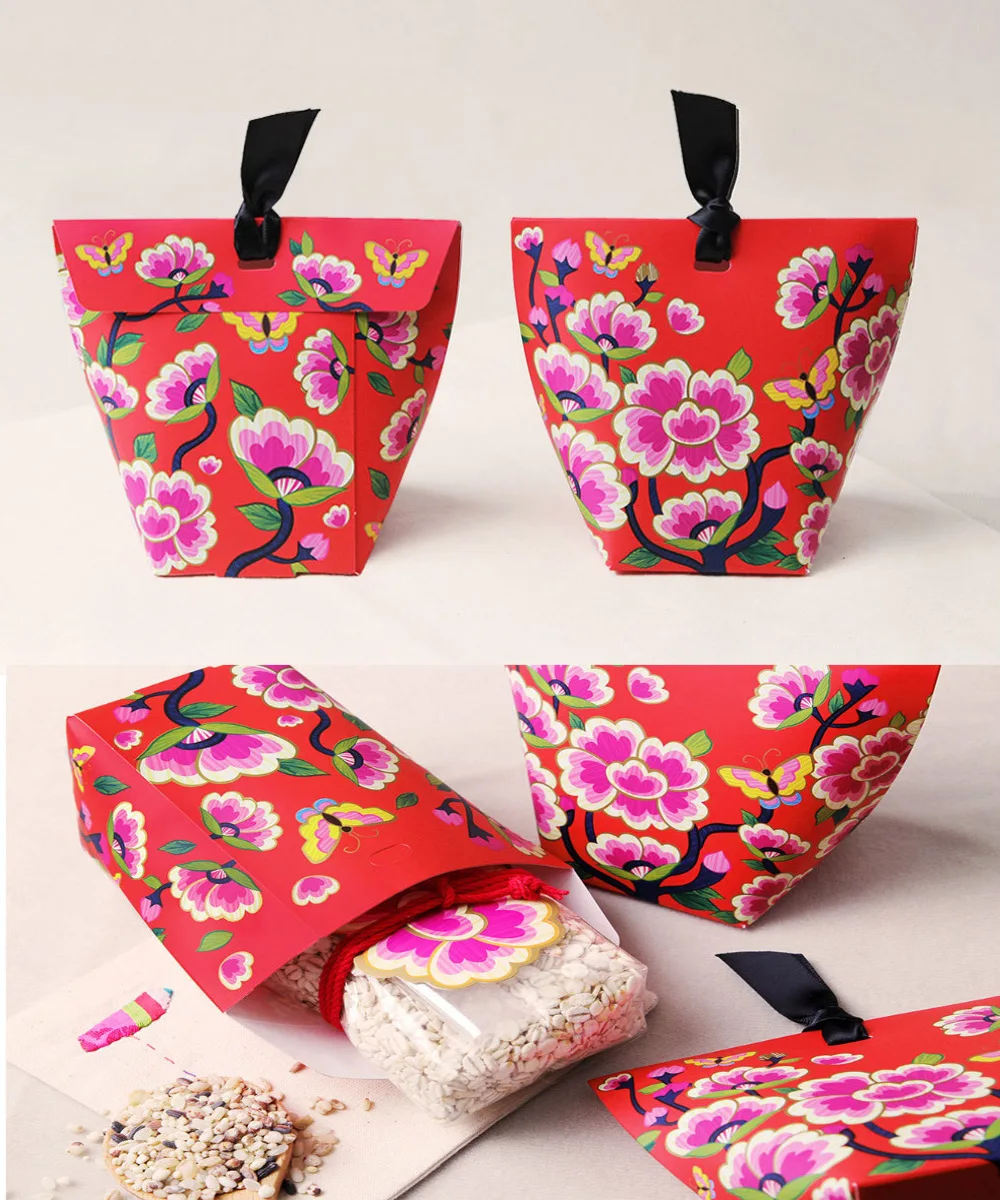 Color:black dots on white background, colored water drops, small flags, golden ingots, hibiscus flowers, rich flowers