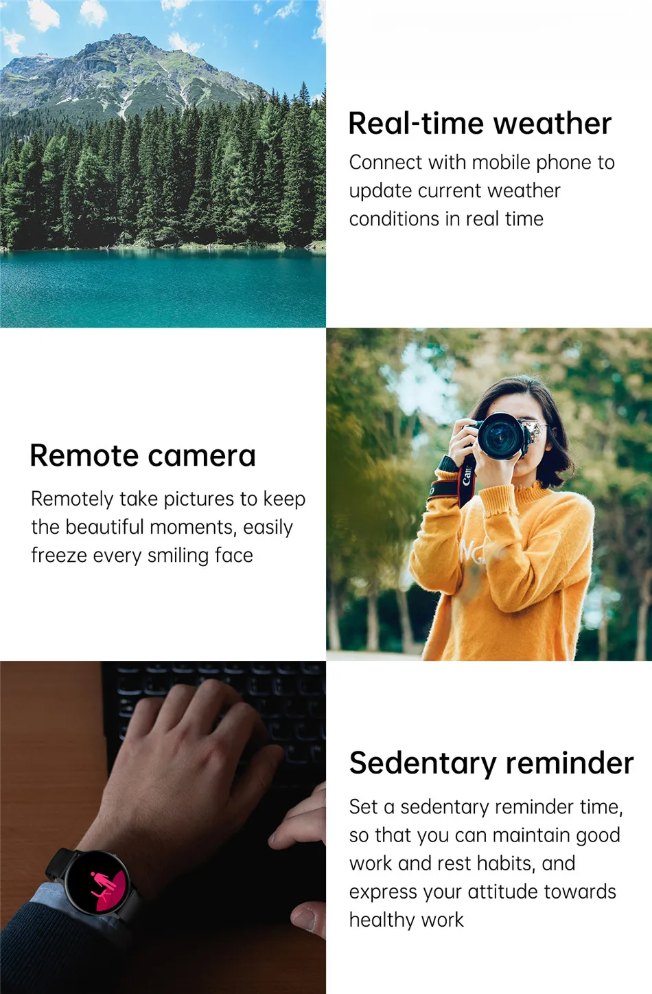 Прием/отклонение телефонных звонков/телефонных звонков с циферблатом, мониторинг сердечного ритма, мониторинг кровяного/кровяного давления, мониторинг сна, напоминание о сидячем положении, спортивный шагомер/потребление калорий/запись отслеживания/время упражнений, напоминание о звонках и отображение, сообщение толкается и отображается, камера дистанционного управления, Автоматическое Измерение частоты сердечных сокращений, измерение нескольких видов спорта, напоминание о часах, напоминание о тревоге, 5 видов циферблатов по умолчанию. Индивидуальные Циферблаты часов в приложении являются необязательными.