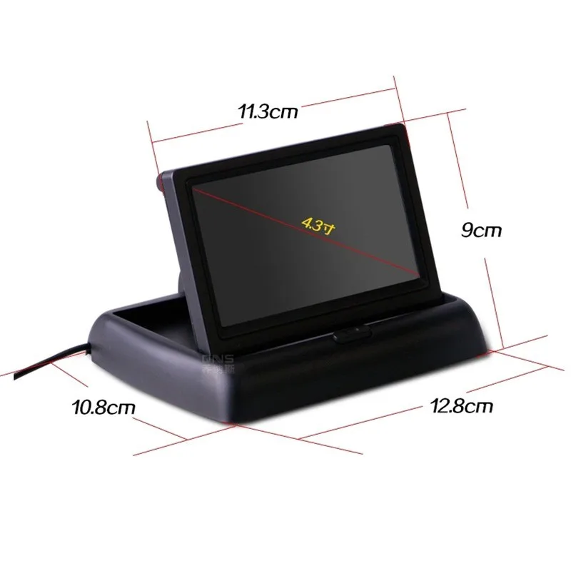 4,3 дюймов складной мониторыКоличество пикселей: 480*272Контраст: 350:1Формат дисплея: 4:3Стандарт: автоматическое переключение двух режимов PAL / NTSCВидео: 2-полосная переворачивании автоматически дисплей AV вход, av-сигнал, автоматическое обнаружение загрузки2 видео входа RCA (один для DVD сигнала, один для камеры заднего вида)Мощность: ≤ 4 ВтИсточник питания: DC12V ~ 24VЧерный экран, когда нет сигналаУстановка: Установка в личном кабинете по 3м стикером для