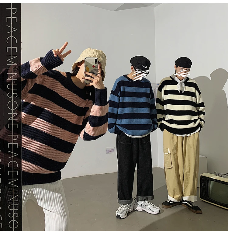 Мужской свитер в полоску, повседневный свободный трикотажный пулове...