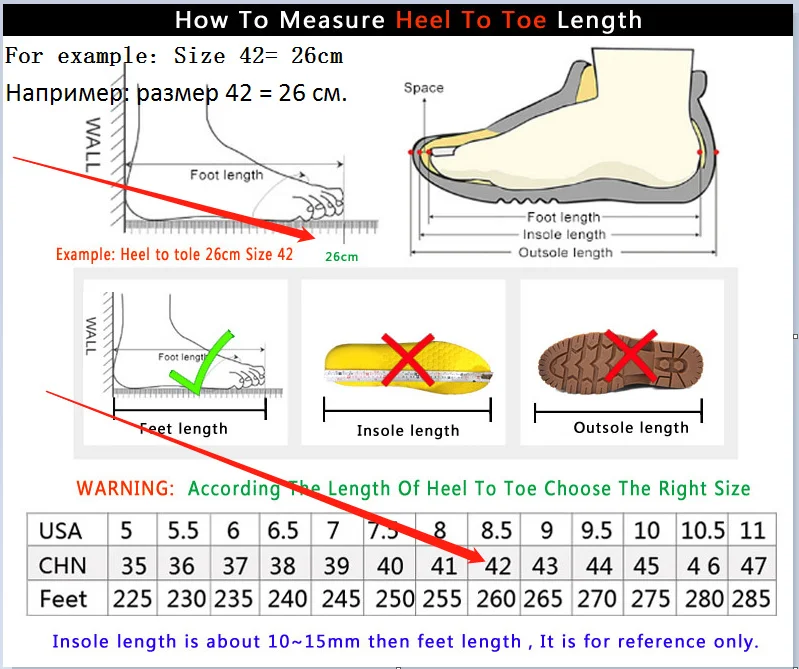 Примечание: Пожалуйста, выберите размер обуви в соответствии с длиной Вашей стопы, а не длиной стельки.