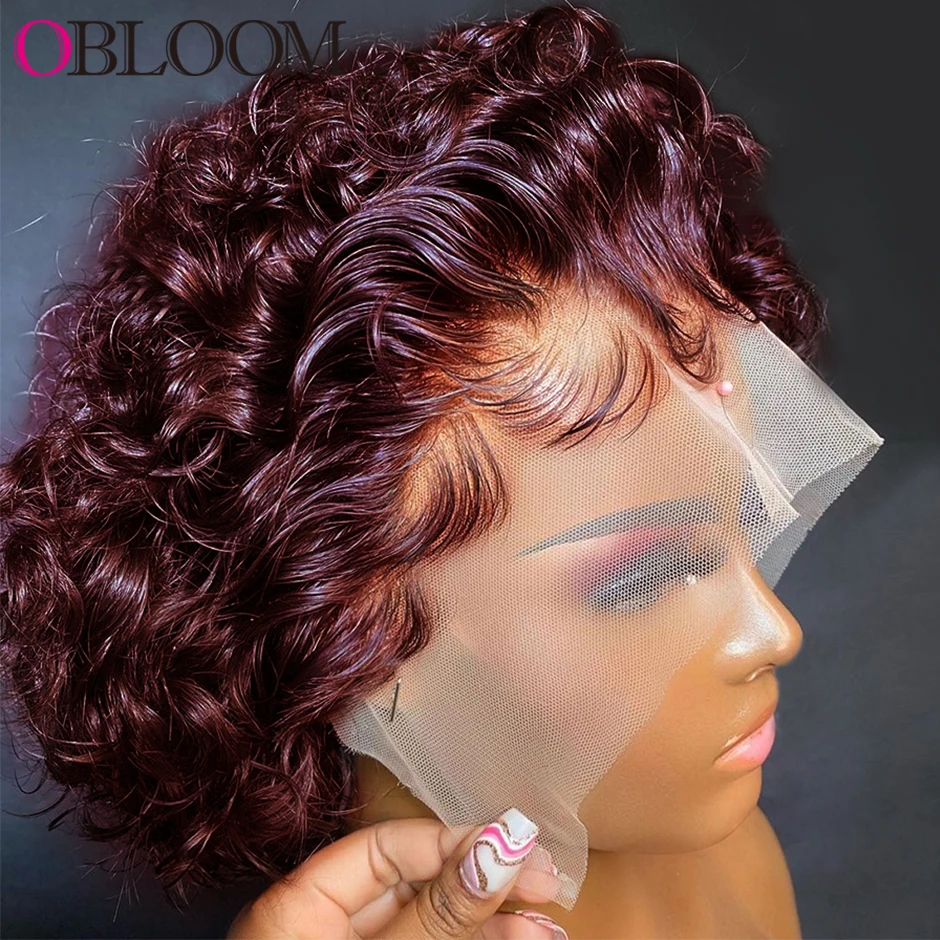 Бордовый 99J парик из человеческих волос на сетке спереди, 250%, короткий вьющийся парик фея, предварительно выщипанные бразильские волосы, парики для женщин, короткий парик