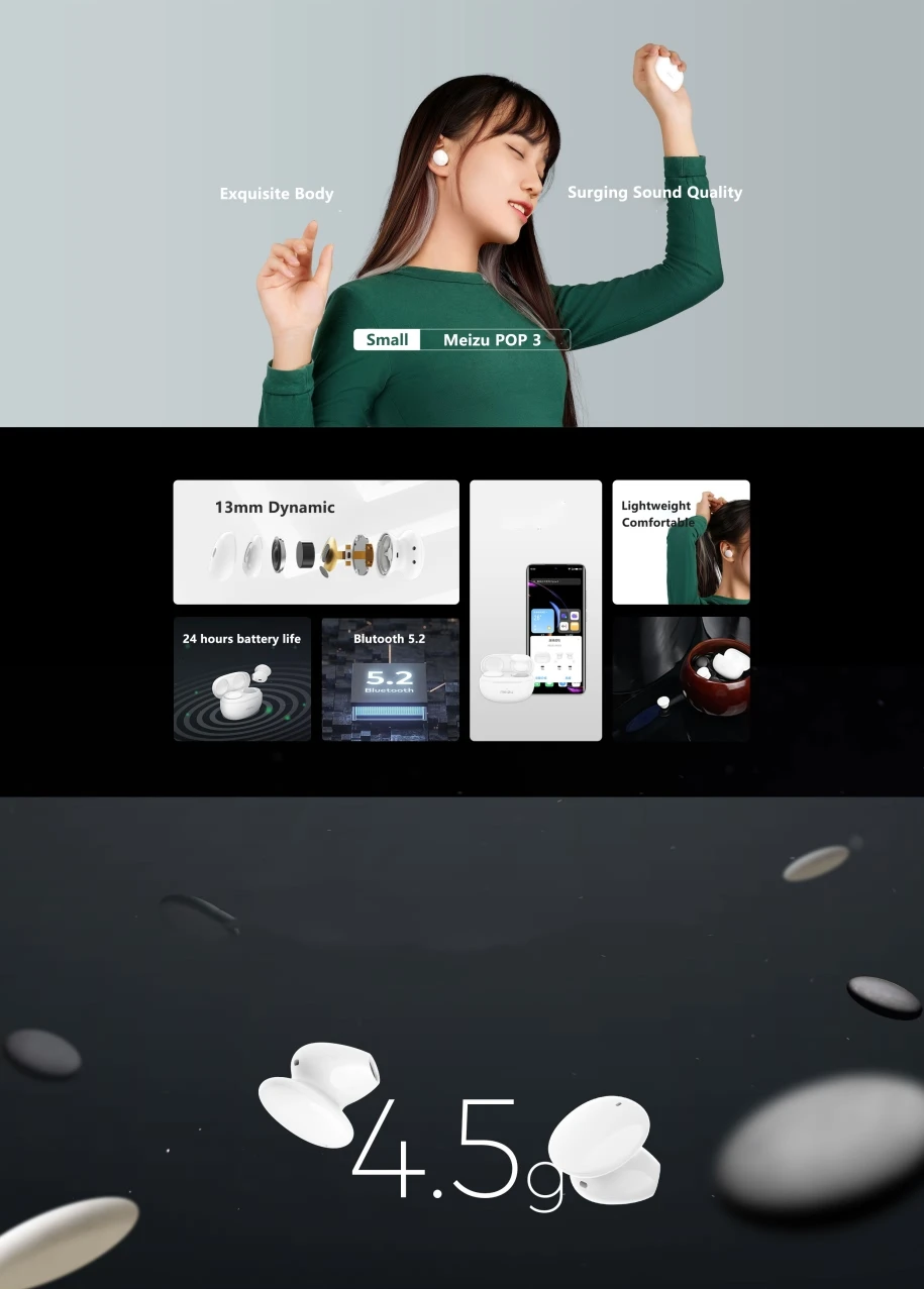 Оригинал, Meizu POP 3, настоящие беспроводные наушники, 5,2 ENC, подавление шума, 13 мм, большой динамический 4,5g светильник, полу наушники