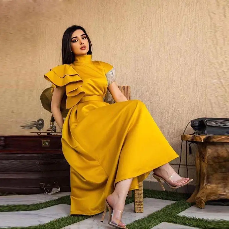 Новое поступление атласные трапециевидные платья для выпускного вечера с высоким воротником бахромой оборками арабские Дубаи Вечерние платья Длинные коктейльные платья
