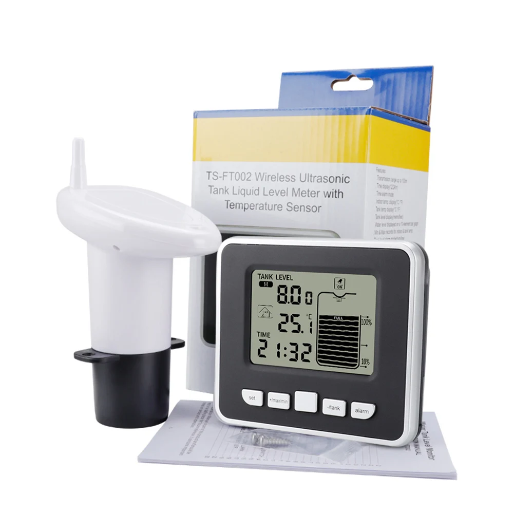 Ультразвуковой измеритель уровня жидкости в резервуаре с датчиком температуры и индикацией времени, сигнализацией, приемником и приемником для измерения глубины жидкостиХарактеристика:1. Прибор контролирует уровень жидкости в баке, который отображается на ЖК-дисплее 10 элементов.2. Он может записывать минимальную/максимальную запись уровня бака. Поддерживает высокий/Низкий уровень жидкости в баке и пустой резервуар сигнализации.3. Внутренняя температура (°F или ° C) и температура коробки (°F или ° C) отображаются одновременно. Приемник может стоять на столе или висеть на стене.Спецификация:Материал: АБС-пластикДиапазон температуры в помещении: 0-60 ° CДиапазон температуры в помещении: 0-60 ° CТочность температуры: ± 1 ℃Диапазон измерения уровня воды: 0 ~ 15 мУвеличение: 0,01 мТочность: + / -0,03 мЧастота передачи: 433 МГцДальность передачи: 100 м на открытой местностиИнтервал передачи: 30 секунд, когда уровень меняется, или 3 минуты, когда уровень остается неизменным.Аккумуляторы приемника: 2 батарейки АА (не входят в комплект).Батарейки для передатчика: 6 батарей AAA (не входят в комплект).Срок службы аккумулятора: не менее 12 месяцев для приемника.Передатчик должен использоваться не менее 12 месяцев.Размер посылка: 165x110x105 мм/6.49x4.33x4.13''Размер ЖК-дисплея: 66x45 мм/2.59x1.77''Тип жидкости: все некоррозионные жидкостиПримечание:Возможны отклонения в 1-3 мм вследствие измерений вручную.Из-за различных дисплеев и различного светильник, изображение может не показать фактический цвет товара. Спасибо за понимание.