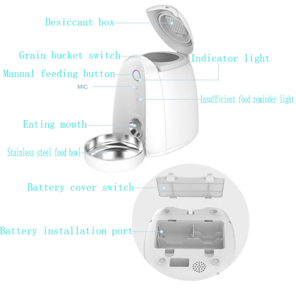 [4,5 литров продуктов емкости] автоматическая кормушка для домашних животных-4,5 литров, подходит для небольших и средних собак домашних животных. Этот питатель для собак может обеспечить вашего питомца едой в течение нескольких дней, чтобы предотвратить голод, особенно когда вы работаете сверхурочно, ночью или в деловых поездках.[Съемный и легко моется] пищевой бак автоматической кормушки для домашних животных является съемным, и лоток для еды из нержавеющей стали съемный для легкой очистки. Специальная конструкция для защиты кнопок проста в установке, а основа устойчива и не скользит для защиты домашних животных. Встроенный инфракрасный датчик может контролировать, Полна ли еда.[Гибкий график подачи] Эта панель кнопки позволяет установить время еды (часы, минуты) и размер еды (размер еды). Этот приуроченный питатель для домашних животных может распределять еду в соответствующее время, 1-4-разовое питание в день (завтрак, обед, ужин, 4-я еда), каждое питание до 20 порций (до 100 граммов).[Рекордер] вы можете нажать и записать свой голос, чтобы напомнить вашему питомцу, что нужно есть. Это голосовое сообщение занимает 10 секунд. Умный питатель для домашних животных будет автоматически играть 3 раза перед каждым приемом пищи, чтобы напомнить им регулярно питаться, оставаться здоровым и чувствовать себя расслабленным, когда вы не дома.[Двойной режим питания и безопасность] Этот питатель питания для домашних животных имеет двойную мощность, режим батареи (требуется батарея 3D размера) и режим питания адаптера переменного тока. Чехол полностью заряжен, режим работы батареи гарантирует своевременное питание вашего питомца. Кроме того, этот автоматический питатель для домашних животных не может быть помещен на открытом воздухе или подвержен воздействию дождя. Держите его сухим, чтобы предотвратить попадание воды в питатель.