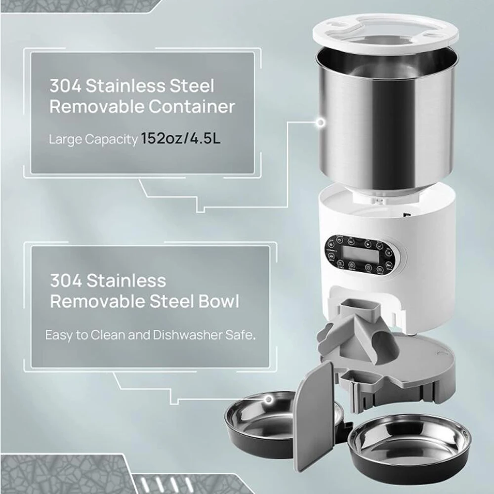 Программируемое время кормления-больше не просыпается домашними животными по утрам, не нужно беспокоиться о кормлении домашних животных, когда выходите! Автоматические кормушки для кошек могут обеспечить своевременное и количественное питание для ваших питомцев, 1-4-разовое питание в день, 1-4 0 порций в еде (5 мг в порции). Начните настраивать здоровую диету для ваших кошек и собак прямо сейчас!2-сторонний разветвитель & 304 Нержавеющая сталь тела-идеально подходит для мульти-питомец семьи. Этот Фидер для кошек 4,5л оснащен двухполосными разветвителями, перегородками, противозасорением конструкции, которые обеспечивают равномерное распределение между 2 чашами. Контейнер для хранения домашних животных и 2 миски изготовлены из нержавеющей стали 304, что обеспечивает более здоровую и гигиеническую еду для ваших питомцев.Двойная конструкция источника питания-даже если отключение питания, не беспокойтесь о том, что пищевой диспенсер для кошек не поставляет еду. Этот автоматический питатель для кошек питается от адаптера постоянного тока 5 В и/или батарей. Даже если питание питателя ПЭТ отключено, 3 Щелочные d-типа батареи будут держать оборудование в рабочем состоянии. Кроме того, он оснащен настройкой памяти, вам не нужно сбрасывать параметры после выключения питания.Диктофон 10s-вы можете позвонить своему питомцу перед едой! Нажмите кнопку «Mic» для автоматической подачи кошек, чтобы записывать голос 10s, регулярно вызывая вашего питомца, и пусть ваш голос будет сопровождать их каждый прием пищи. Вы также можете отменить запись, до еды не будет воспроизводиться голос.Простота и удобство в эксплуатации-простая установка/разборка + четкое Программирование позволяют начать работу за 5 минут. Легко моется и поддерживает посудомоечную машину-304 материал из нержавеющей стали прост в очистке, поддерживает автоматическая кормушка для кошки контейнеры для хранения пищи и 2 миски были вымыты в посудомоечной машине. (Примечание: Основной блок с дисплеем нельзя мыть)