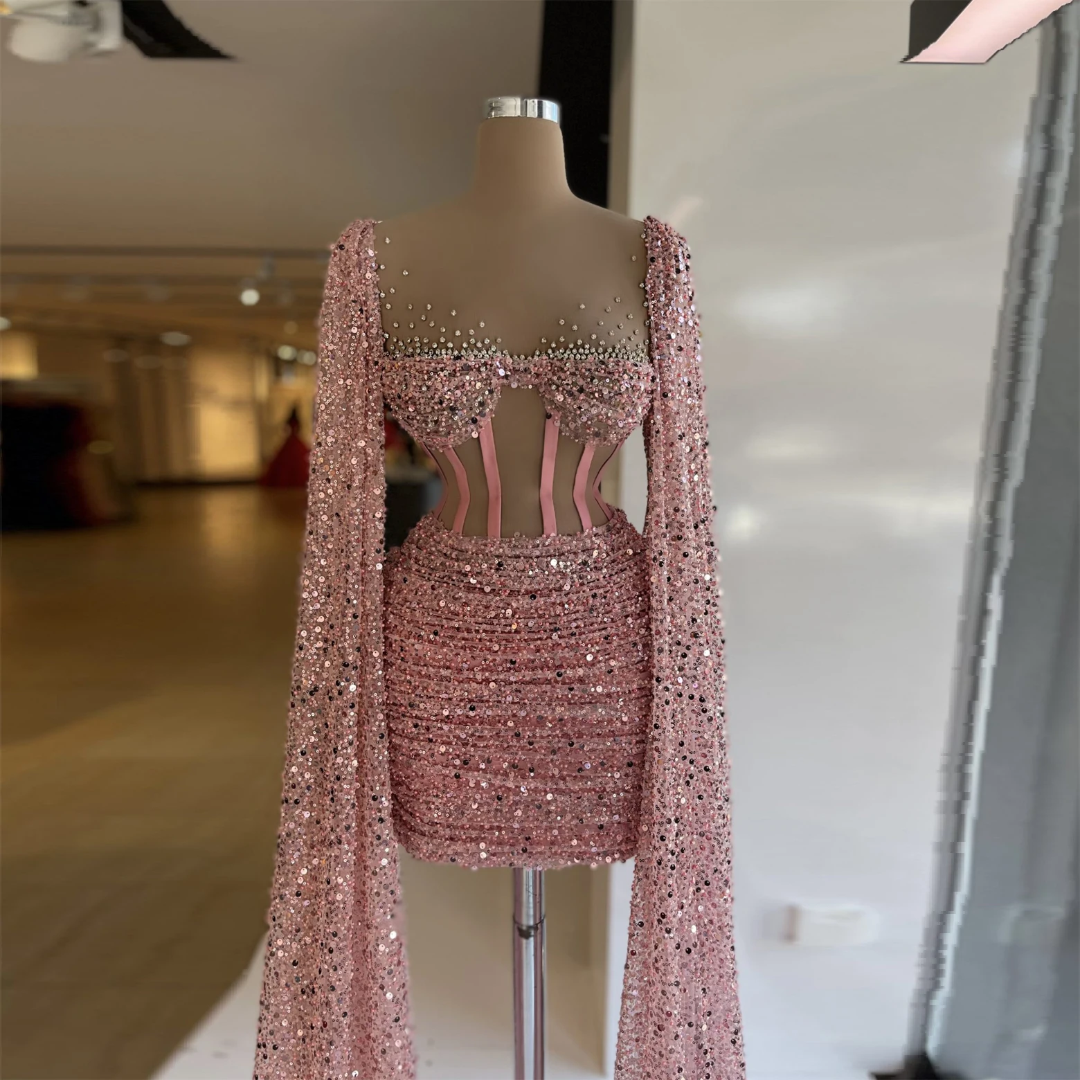 Женское коктейльное платье, розовое блестящее элегантное платье с длинным запахом, со шлейфом, Короткое мини-платье для выпускного вечера, индивидуальный пошив