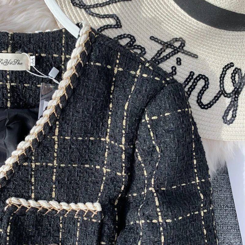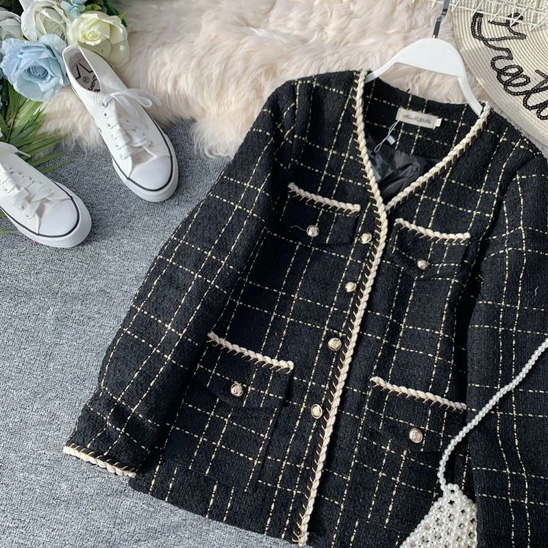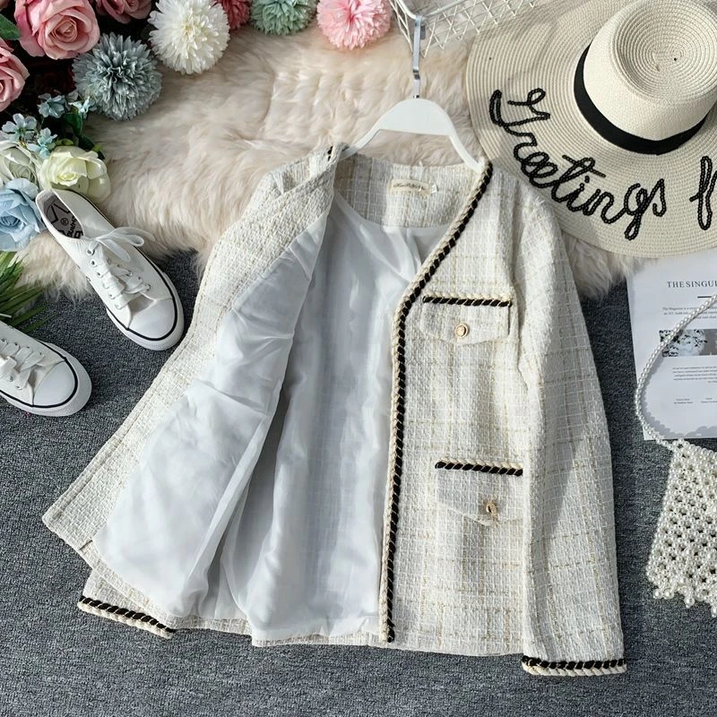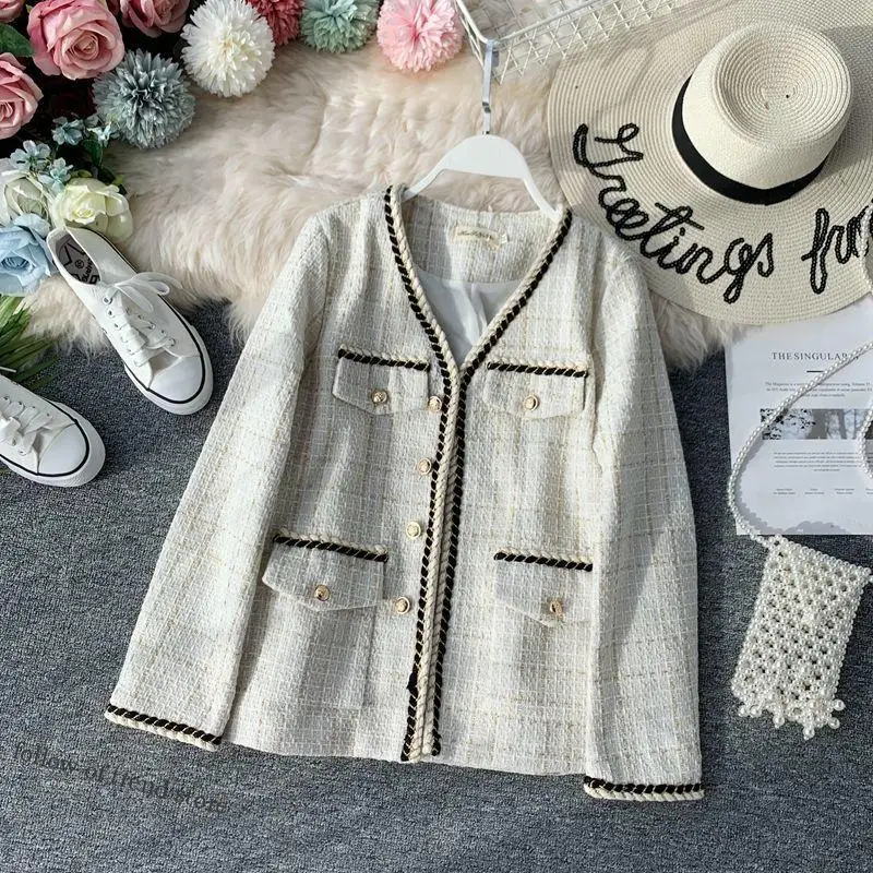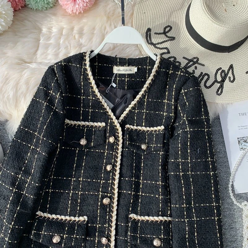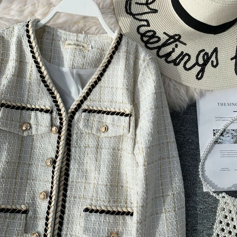 Женское шерстяное пальто в клетку, Роскошный дизайнерский твидовый пиджак в стиле ретро для офиса принцессы с V-образным вырезом и широкой талией, роскошный белый пиджак в Корейском стиле