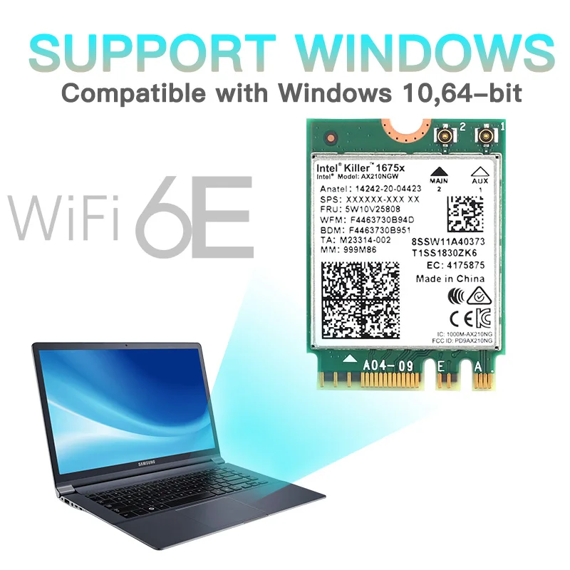 1. Модель: Новый Wi-Fi 6 AX210 (AX210NGW);2. Интерфейс: M.2 NGFF, не совместим с M.2:CNVI;3.Dual band: 2,4 ГГц/5 ГГц (160 МГц);4. Скорость до 2400 Мбит/с (маршрутизатор должен быть на 160 МГц)(802.11ax);5. Поддержка Bluetooth 5,2;6. Поддержка MU-MIMO;7. Поддержка Windows 10 64bit, Linux;8. Примечание: не поддерживает Windows 7/8/8.1.9. Совместим с: он может использоваться на Samsung /Dell/Sony/ACER/ISUS/MSI/Clevo/Terransforce/Hasee и т. Д. (не включает lenovo и HP, если он может использоваться после перезаписи белизны).Не поддерживает Ноутбук IBM/Thinkpad/lenovo/hp.
