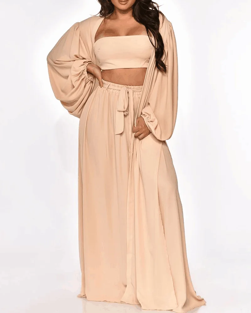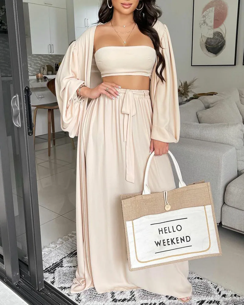 Модный женский комплект из трех предметов, осень 2021, укороченный топ и юбка макси с удлиненным кардиганом, элегантный женский костюм