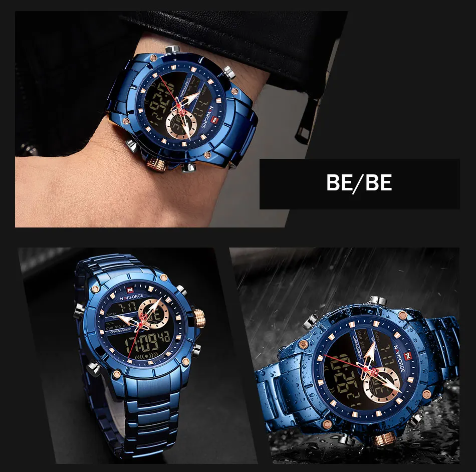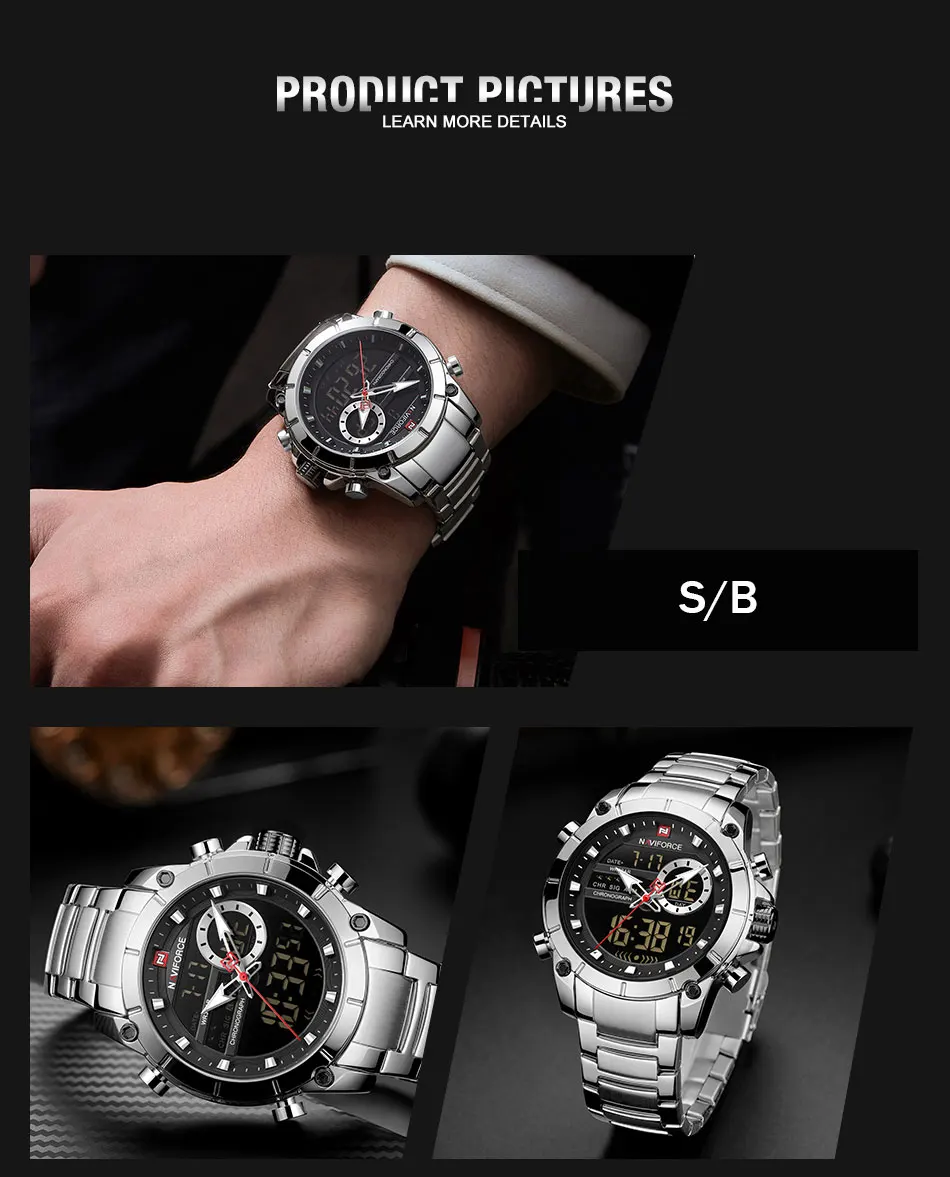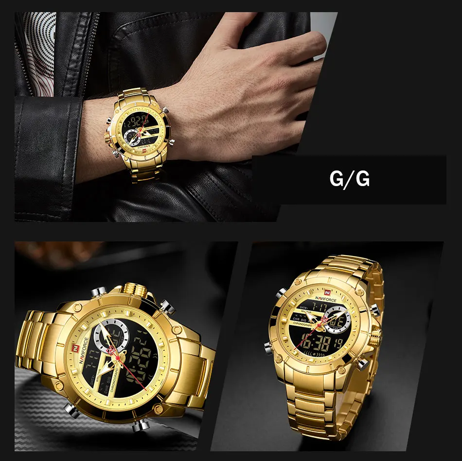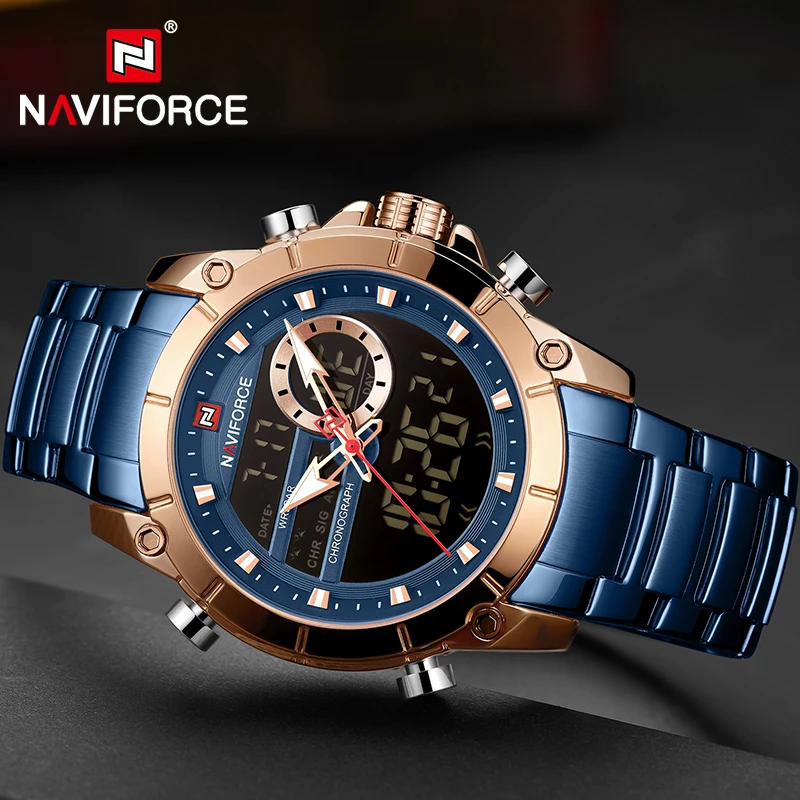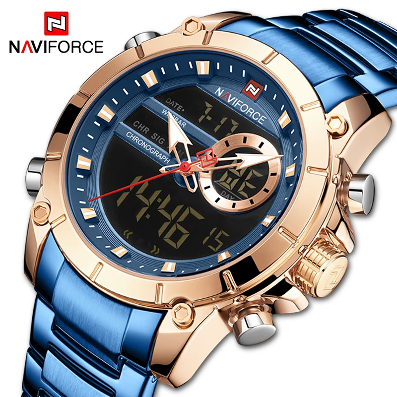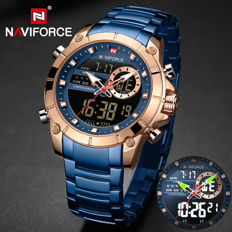 Часы наручные NAVIFORCE Мужские кварцевые, водонепроницаемые светящиеся с двойным дисплеем и большим циферблатом, из нержавеющей стали