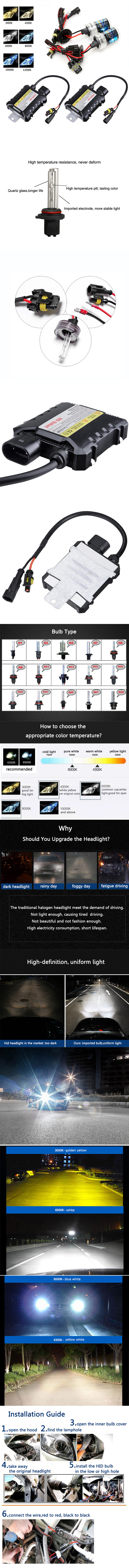 Характеристика:1. Срок службы: более 3000 часов2. Низкое энергопотребление3. Чистая кварцевая лампа с защитой от ультрафиолета4. Процент дефектов менее 0.1%5. Тип лампы:Одна лампа: H1 H3 H4-1 H7 H8/H9/H11 9004/9007-1 9005/HB3/H10 9006/HB4 H13-1 880/881/H27 ксенон и галогенная Высокая Низкая лампа: h4-2 H13-2 9004/9007-2 Высокая Низкая Биксеноновая лампа: H4-3 H13-3 9004/9007-36. Цветовая температура: 3000k-желтый 4300k-желтый белый 6000k-холодный белый 8000k-синий белый 10000k-светло-голубой 12000k-синий темно-синий или другой цвет, пожалуйста, свяжитесь со мной, спасибо.PS: высокая температура цвета не означает более яркий, это означает, что цвет отличается. Все детали для вашей справки, мы отправим вам то, что вы выбрали, спасибо.