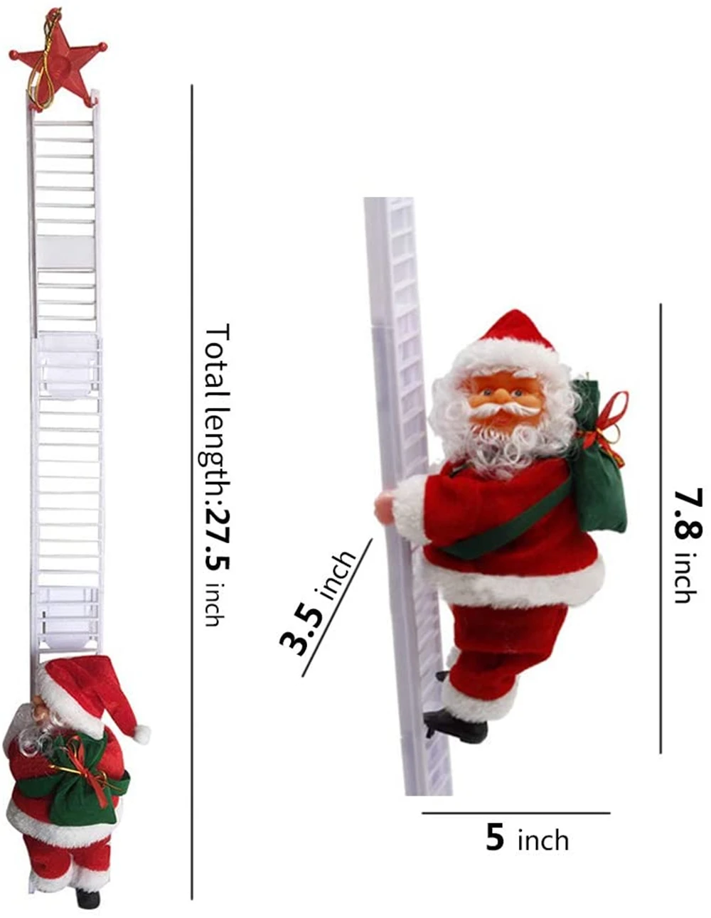 Размер: 19*9*12,5 смДлина лестницы 65 см (включая пятиконечную звезду 70 см) для пожилых людейПитание от 3 батареек AA (не входят в комплект)Этот Веселый Санта поднимается по лестницы с сумкой подарков.Очаровательный возле вашего дерева или камина, Санта носит свой традиционный красный костюм, когда он поднимается по белой лестницы и поет «колокольчики».Изготовлен из плюшевой ткани.Идеальный подарок: как рождественский подарок, он не только может украсить ваш дом, улучшить атмосферу фестиваля, но и лучший выбор для ваших детей в качестве рождественского подарка.