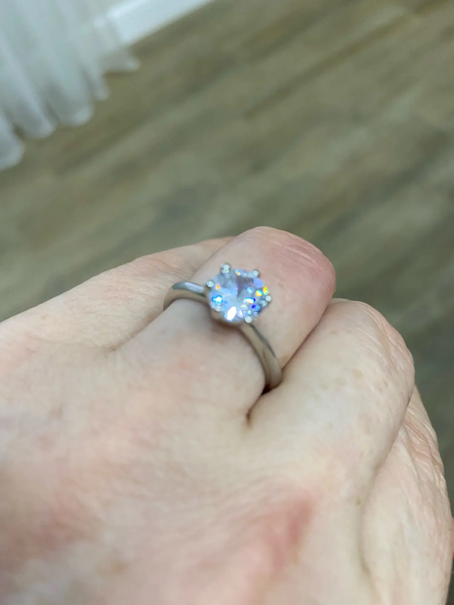 Кольцо белого цвета, т. к. покрыто серебром, хорошо отполировано. Размер 8, как и заказывал. Верхняя часть камня имеет хорошую бриллиантовую огранку. При освещении точечным источником света камень красиво сверкает, подобно алмазу или фианиту (циркону).