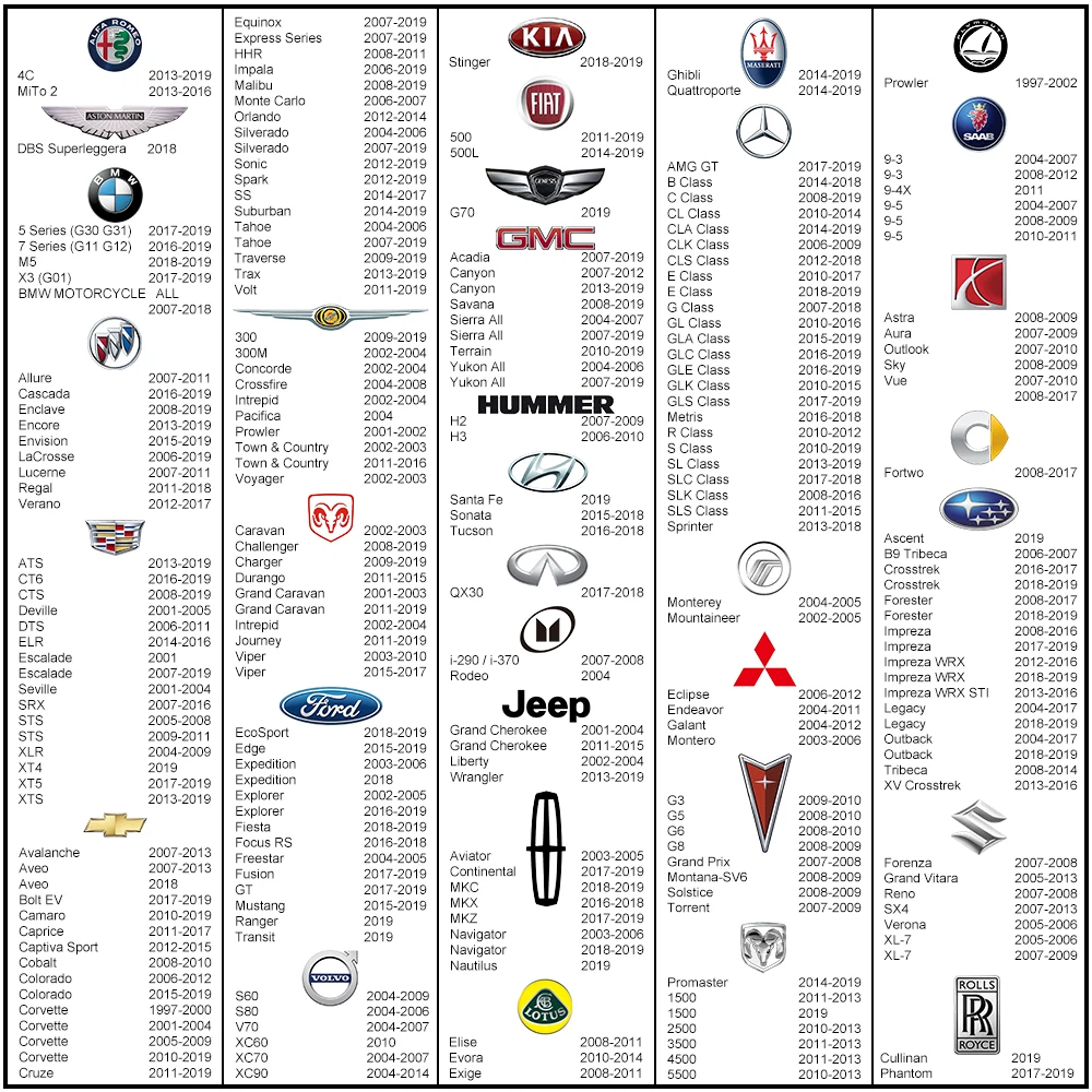 Универсальный инструмент TPMS realern совместим с большинством автомобилей марки: для Alfa Romeo, BMW, Buick, Cadillac, chevrollt, Chrysler, Dodge, Fiat, Ford, GMC, Hummer, Hyundai, Infiniti, isuzu, Jeep, Kia, Lincoln, Lotus, Maserati, Mercedes-Benz, Mercury, Mitsubishi, Pontiac, Ram, Retrofit, Rolls Royce, Saab, Saturn, Subaru, Suzuki, Volvo ect, поддержка модели до 2019 года.[Не для Nissan Xtrail, Porsche Cayenne Panamera]