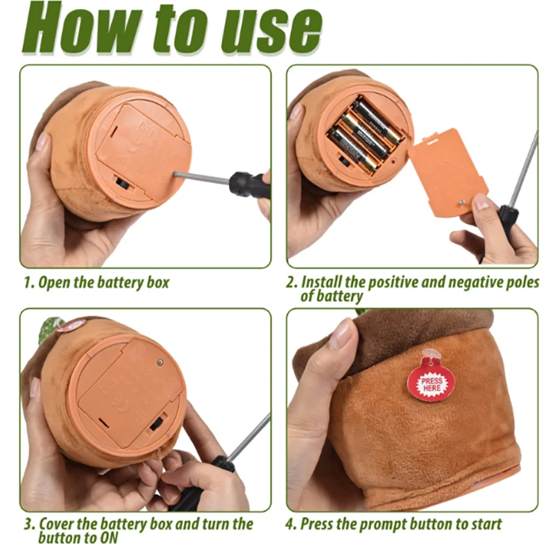Название продукта: танцующий кактусРазмер: 32 * 12c mМатериал: трехмерный полипропиленовый хлопокТкань: мягкая ткань 120 песенОсобенности:①Запись в течение 15 секунд②Learn говорить③ Будет светиться④USB зарядки⑤Able для ТанцыПлюшевая игрушка (плюшевая игрушка) изготовлена из плюшевой ткани, полипропиленового хлопка и других текстильных материалов в качестве основной ткани, а интерьер наполненИгрушки, изготовленные из различных stuffings, также можно назвать мягкими игрушками. В настоящее время мы обычно называем плюшевую игрушечную индустрию набивной игрушкой.Плюшевые игрушки имеют реалистичную и симпатичную форму, мягкое прикосновение, не боясь сдавливания, легко чистить, сильное украшение, высокую безопасность и широкий спектр применимых людей.Плюшевые игрушки симпатичны по внешнему виду и удобны в руке. Это хороший выбор в качестве подарка.Применимые люди: эта игрушка подходит для взрослых и детей, а также для пожилых людейКнопка 1: функция записиДлительное нажатие, чтобы записать звук и отпустить кнопку после завершения записи; Короткое нажатие, чтобы воспроизвести запись прямо сейчасКнопка записиДлительное нажатие, чтобы записать оригинальный звук в течение 15 секунд, короткое нажатие, чтобы воспроизвести звукКнопка 2: функция пенияКороткое нажатие для воспроизведения песни, затем короткое нажатие дважды, чтобы перейти к следующей песнеПорт USB для зарядки:1. Светильник индикатора зарядки включен2. Полный светильник индикатора выключаетсяОбновление USB прямого заряда1. Циклическая зарядка литиевой батареи экономит проблемы с батареей, нет необходимости менять батарею!2. Время использования 1 час, зарядка 3 часа. При достижении уровня полной зарядки станет гореть, функцию автоматически прекратит зарядку, индикатор светильник включен, и индикатор светильник выключается при полном заряде.Режим обучения говорить-это изменение голосаРежим записи-это оригинальный звукКнопка записиДлительное нажатие для записи оригинального звукаВ течение 15 секундКороткое нажатие для воспроизведения звукаКнопка песниНажмите для воспроизведения музыкиВстроенный 120 песенКороткое нажатие для переключения песенОсобенности:Милый смайликБольшие глазаПлюшевый цветочный горшокРеалистичное моделированиеНижний источник питанияПереключательОчаровательная осанкаТанецБезопасность: откажитесь от флуоресцентного агента | Не легко линять волосы | Безопасно и будьте увереныИнструкции по зарядке USB:Зарядка, как мобильный телефон, простая и удобнаяПодключите прилагаемый зарядный кабель, зарядная головка USB поддерживает внешний аккумулятор, порт USB компьютера, мобильный телефон, зарядную головку, зарядка около 3 часов (светильник выключен), И кактус не может использоваться при зарядке или зарядкеИнструкции по ежедневному обслуживанию:Очистка поверхности: рекомендуется протирать влажными салфетками или одноразовыми чистящими средствамиНе подвергайте воздействию прямых солнечных лучей, Избегайте высоких температур и Остерегайтесь сильного давления