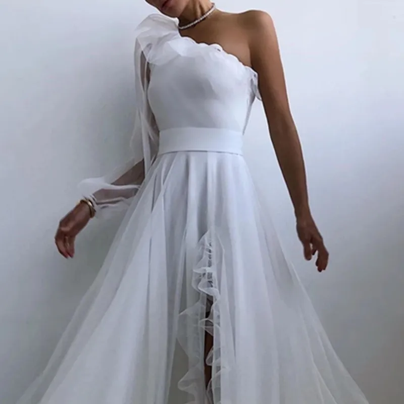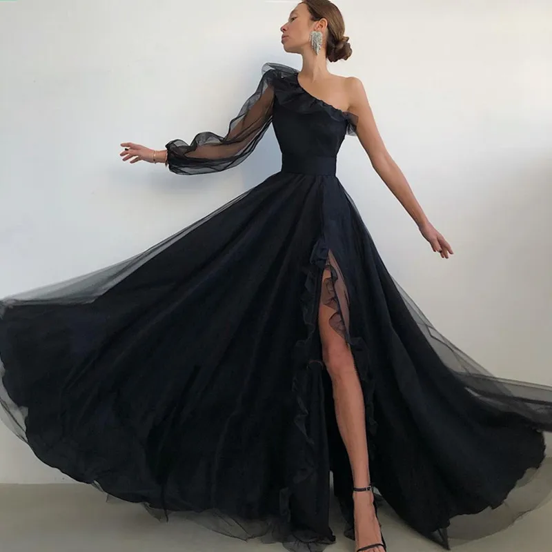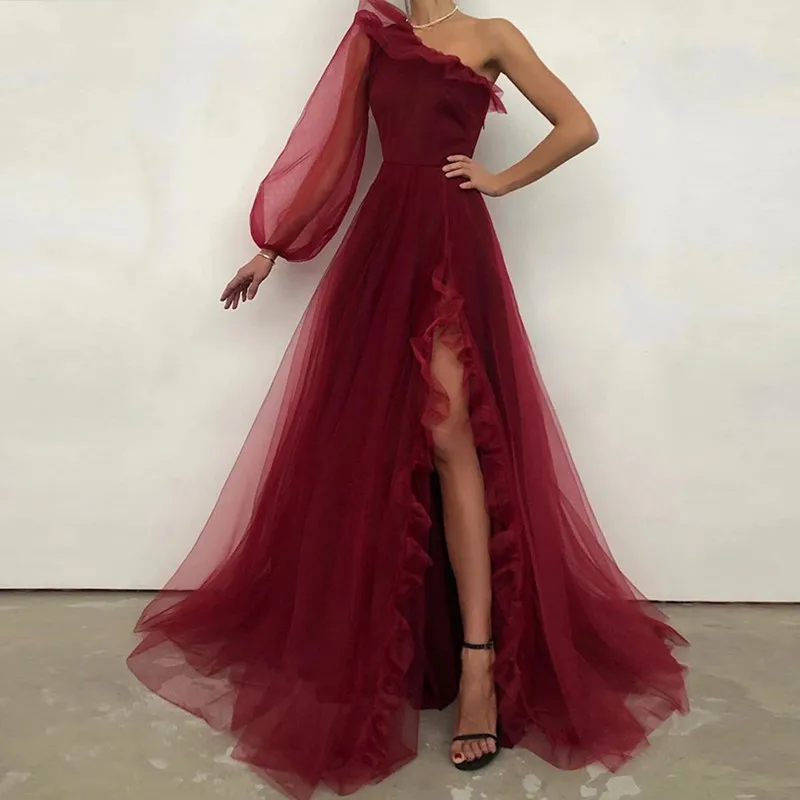 Модное Вечернее платье-трапеция на одно плечо 2021, женское платье с длинным рукавом, платье с высоким разрезом сбоку для вечеринки