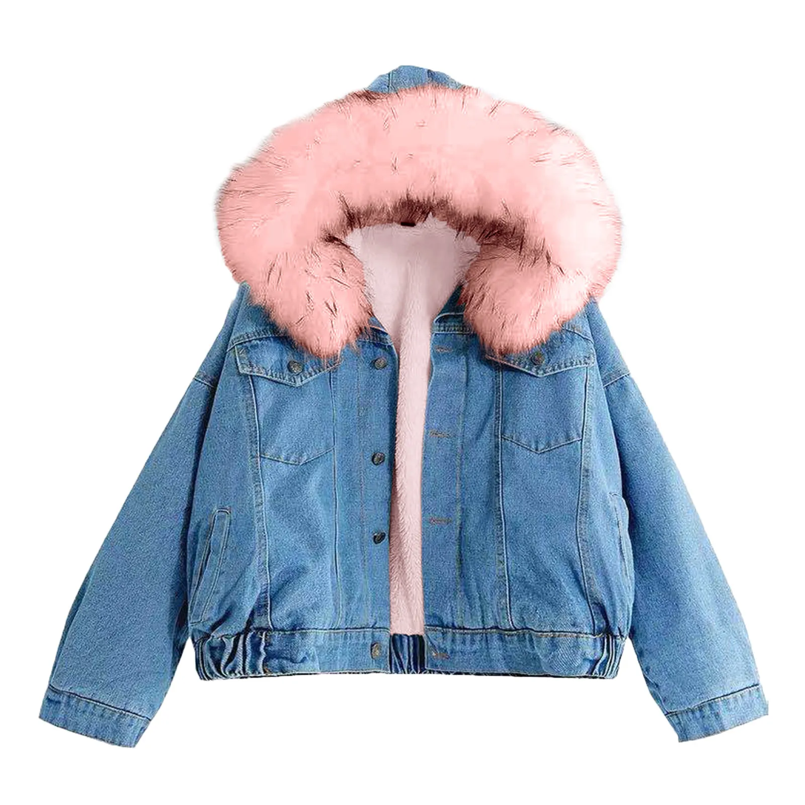 Куртка женская джинсовая, осенне-зимняя, теплая, пушистая, с меховы...