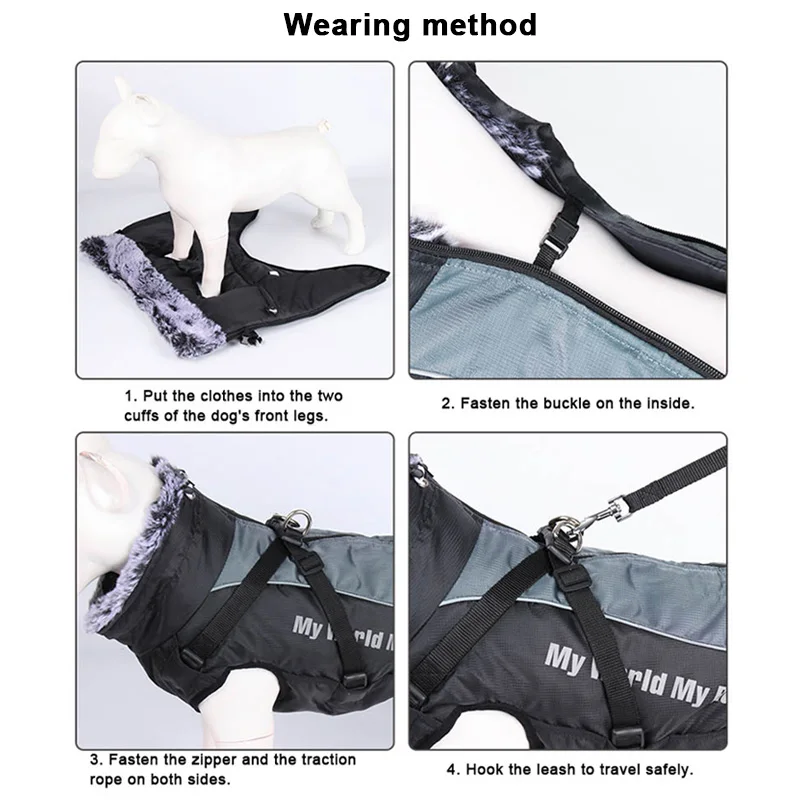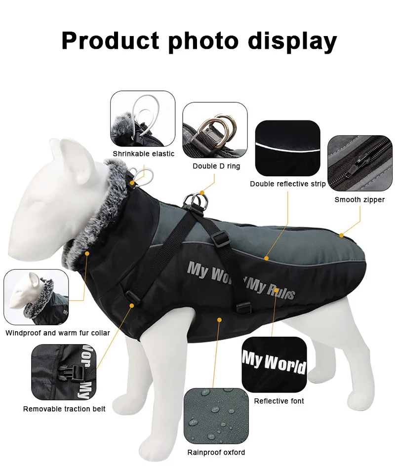 1. Двусторонний светоотражающий материал.2. Плотно прилегающий дизайн для большего тепла.3. Теплый плюшевый вырез можно сложить.4. Скрытая пряжка.5. Наполнитель из мягкого хлопка, пушистый и теплый.6. Внешний Оксфорд водонепроницаемый.7. Съемный задний регулируемый поводок.