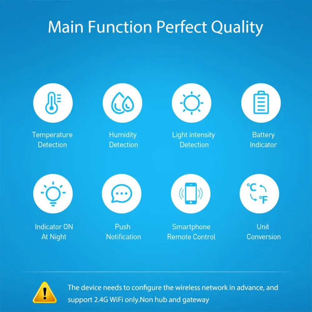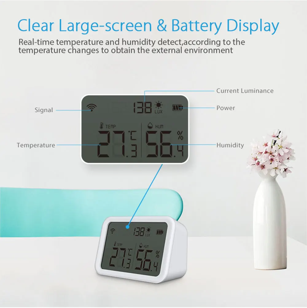 1. Датчик температуры и влажности может быть соединен с другими смарт-устройствами в доме, чтобы улучшить нагрев и охлаждение в помещении, и сделать ваш дом более комфортным;2. Конструкция с низким преимуществом обеспечивает длительный срок службы батареи;3. Встроенный Высокоточный цифровой датчик может быстро и точно находить изменения температуры и влажности;4. Загрузите smart life /Tuya smart APP на свой телефон и планшет для управления пультом дистанционного управления Wi-Fi и проверки температуры/влажности в любом месте/в любое время;5. ЖК-экран динамически отображает значения в реальном времени, передает комфортное состояние домашней среды, соединен с шлюзом и облачной платформой, и мобильное приложение может просматривать текущие и текущие данные температуры;6. С светильник с датчиком, он может обнаруживать светильник значение интенсивности и установить функцию автоматического отзывы по светильник значение интенсивности;