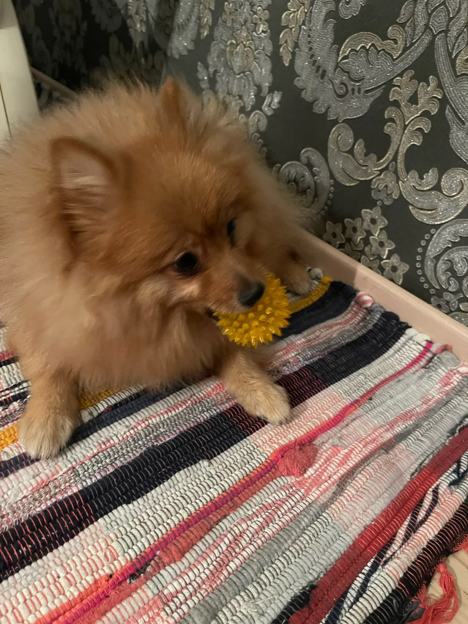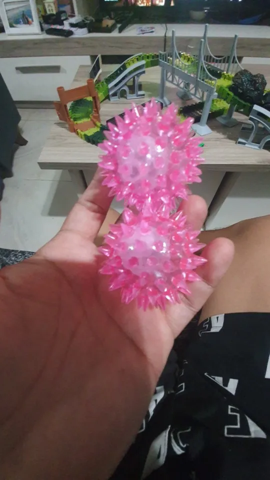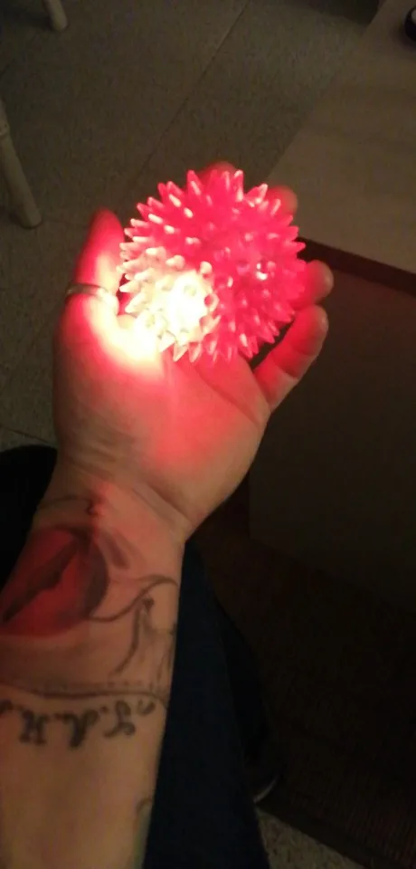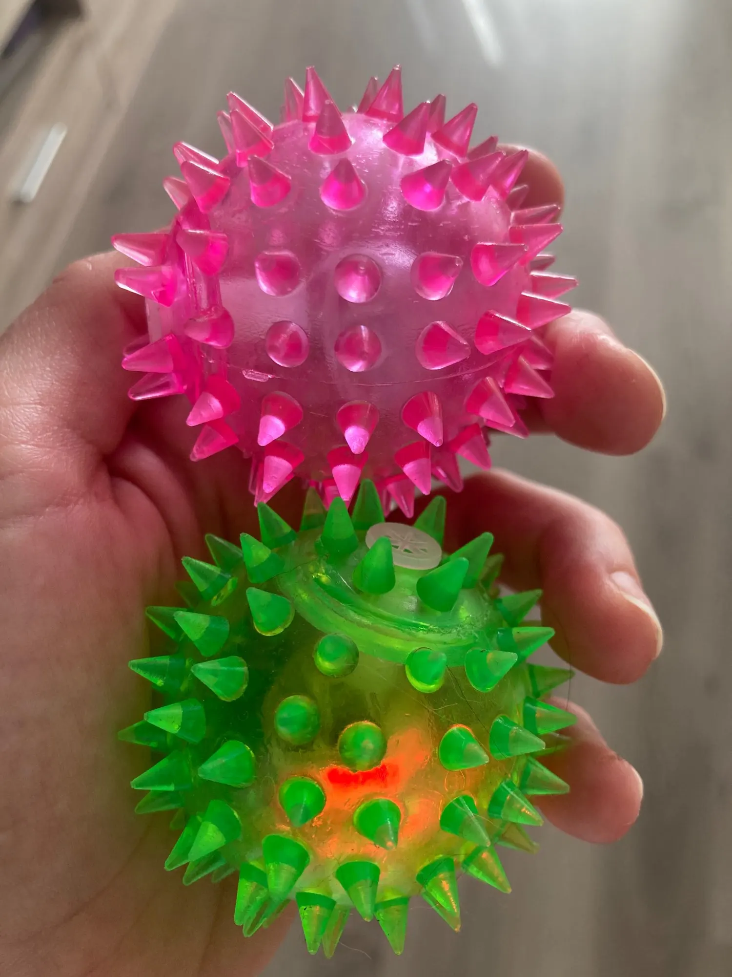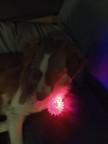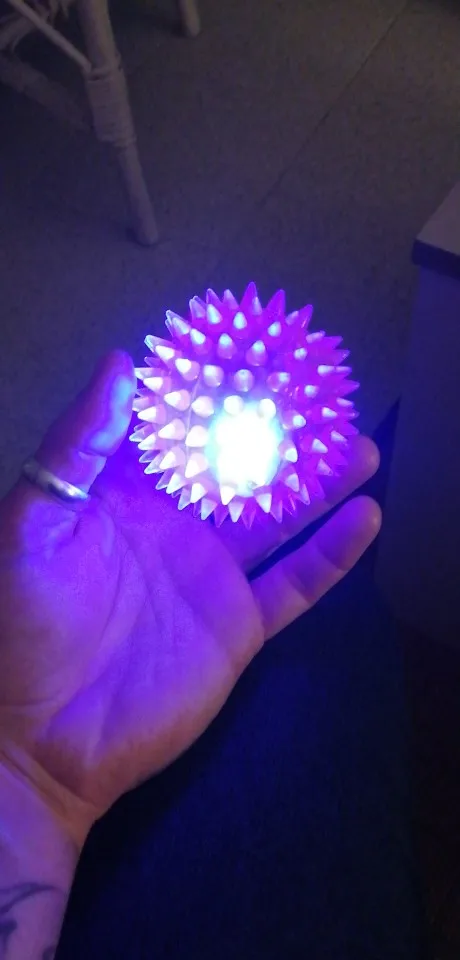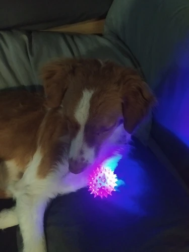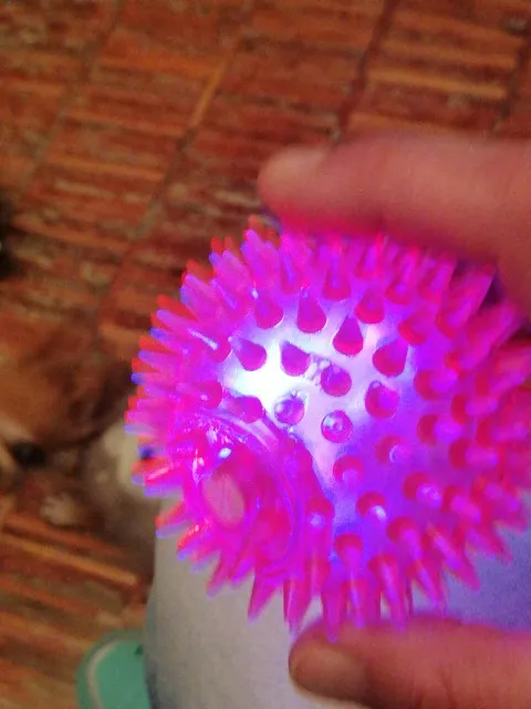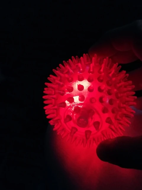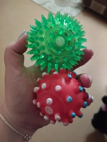 Очень классный мячик, прыгучий, светиться если бросать, но быстро перестаёт гореть если не бросать, не пинать и т.д. Думала, что он будет жёсткий на ощупь, но он мягкий, пищит громко и собака довольна;3 Пришёл за 2-3 недели до Москвы.