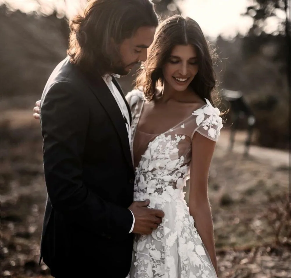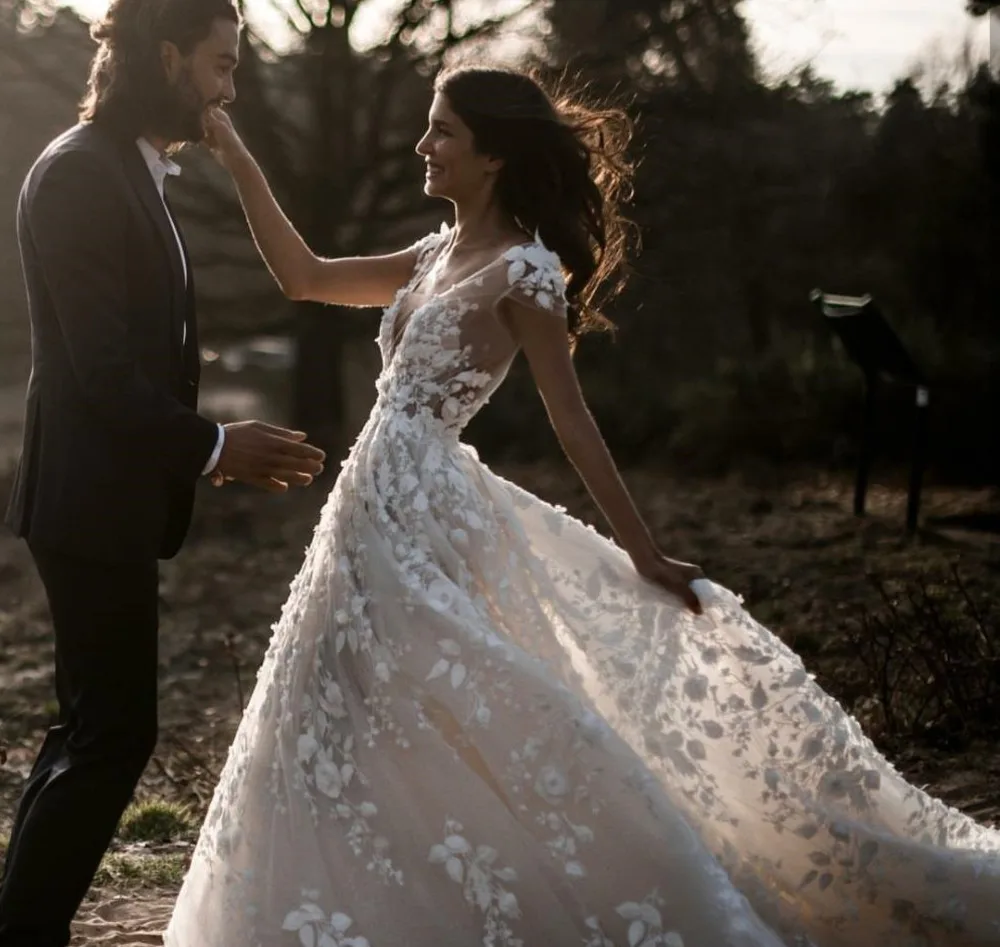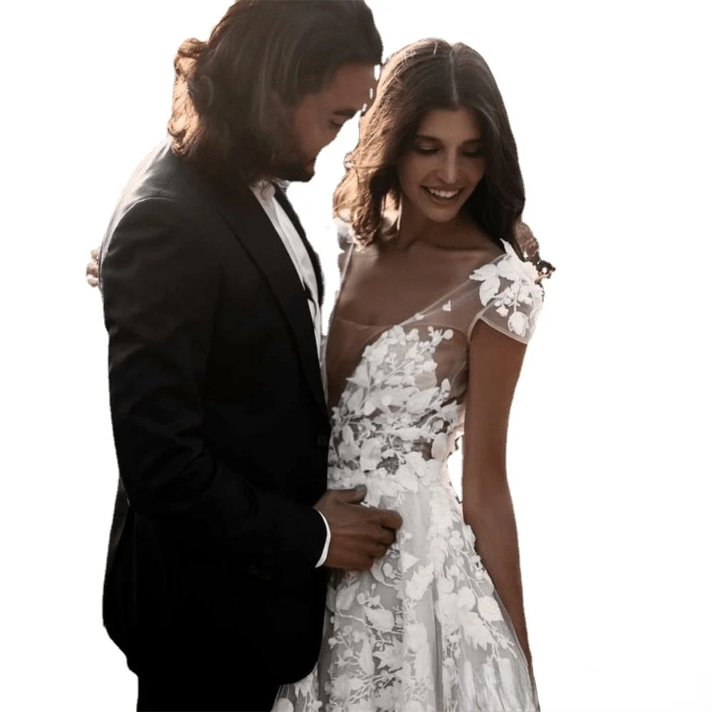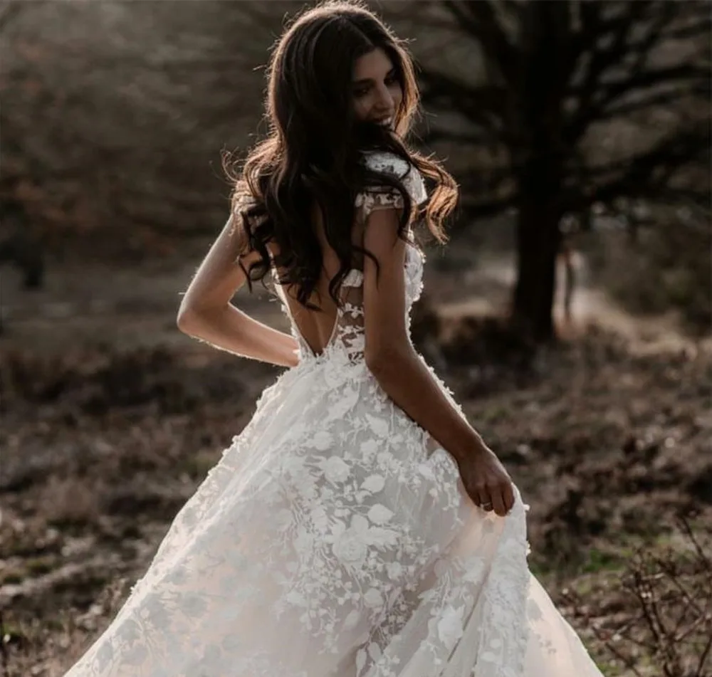 Женское свадебное платье с коротким рукавом, глубоким V-образным вырезом и 3d цветочной аппликацией