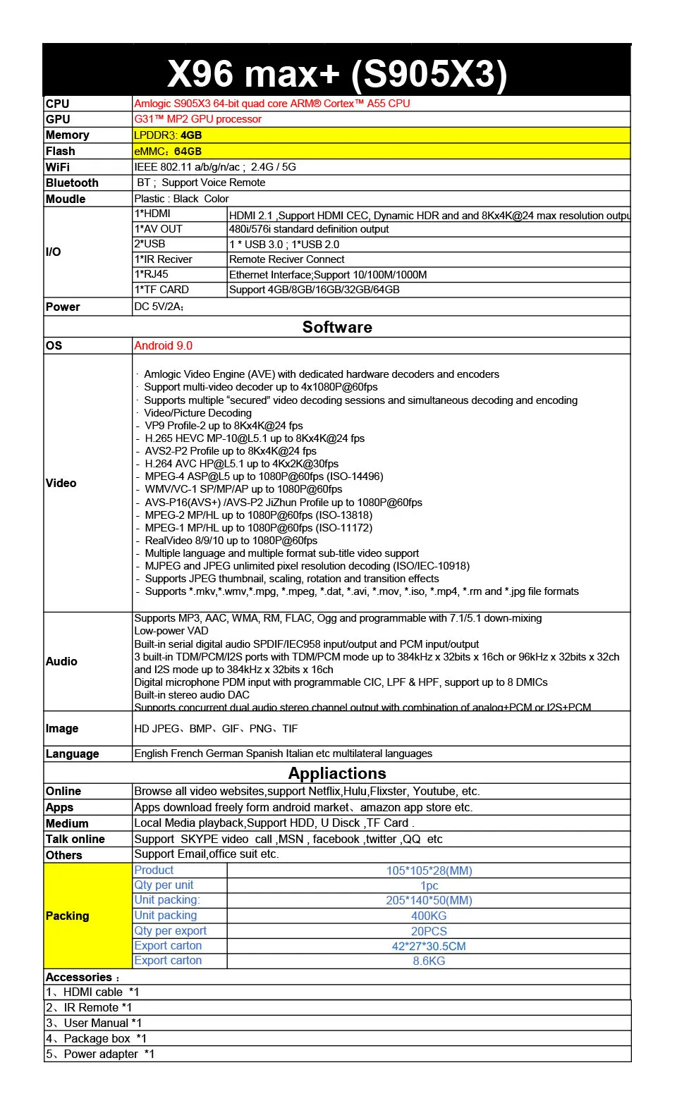 X96 Max Plus 8K Smart TV BOX 4G 64 ГБ 32 ГБ S905X3 Full HD 1080P Bluetooth V4.1 2,4/5G WIFI X96 MAX Plus Android 9.0 TV BOX