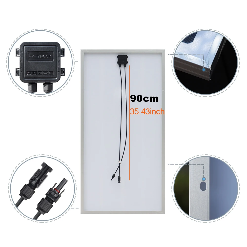 Vmp: 20 вVoc: 24 ВДопуск на выход: ± 3%Диод: 2 байпасаРаспределительная коробка: класс IP67Диапазон температур: -20 ℃-+ 80 ℃Рама: тяжелый и твердый алюминиевый сплавВид стекла: 3,2 мм закаленное стеклоВыход кабеля: 2.5mm см²/14AWG 90 мм/3,54"Размеры: 1160*530*25 ммВес: 6,5 кгSTC: излучение 1000 Вт/м² температура 25 ℃ AM = 1,5