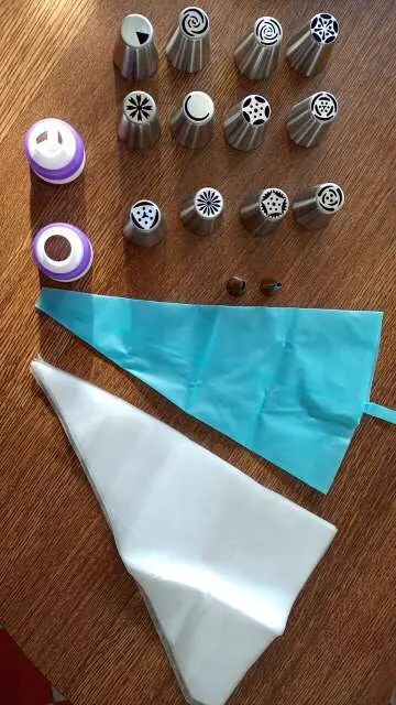12 глазурных наконечников для России + 2 наконечника для трубопроводов с листьями + 1 Трехцветная муфта + 1 одноцветная муфта + 10 одноразовых кондитерских мешков для трубопроводов + 1 многоразовый силиконовый пакет.