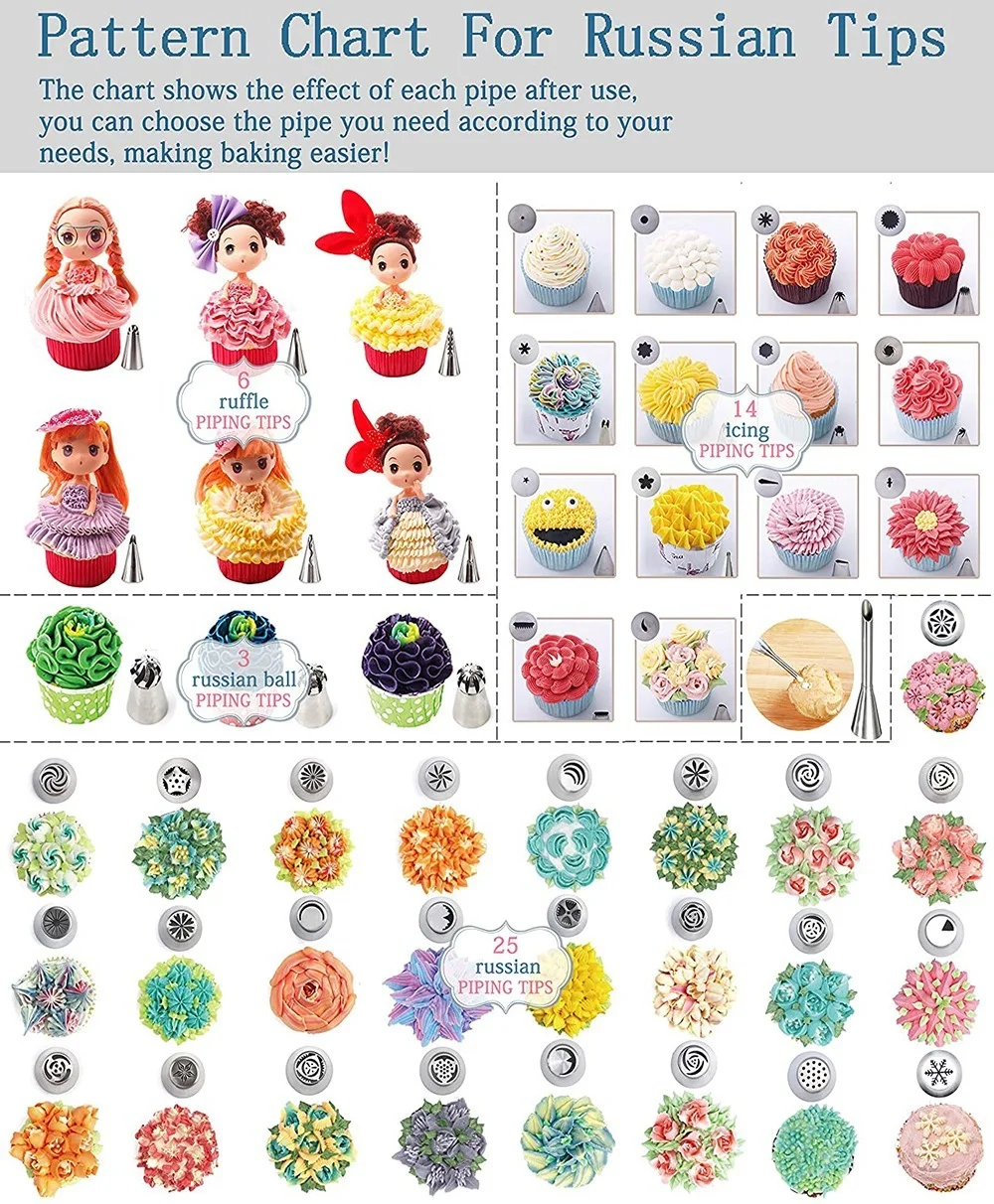 ★Советы по декорированию торта:Поставляется с красочным кончиком, показывающим основные узоры украшения каждого наконечника глазури и связанных с ним идей дизайна кексов, с ним вы обнаружите, что декорирование тортов или кексов может быть таким же простым, как это может быть! Вы можете создать настоящий шедевр дома самостоятельно! Просто вообразите сюрприз вашего мужа или гостей, когда вы скажите им, что эти роскошные кексы были сделаны вами!