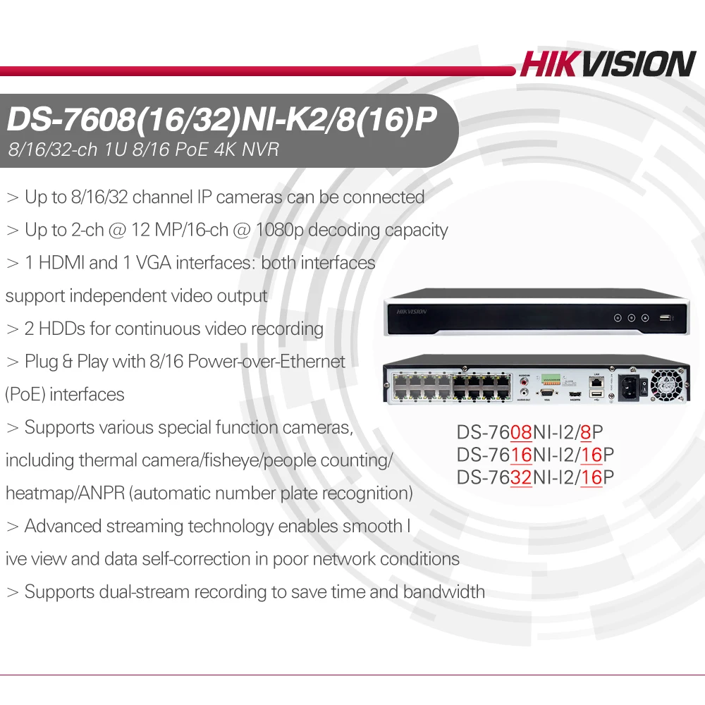 Hikvision NVR DS-7608NI-I2/8P DS-7616NI-I2/16 P DS-7632NI-I2/16 P 8/16/32CH 8/16 POE 12MP H.265 + 2 SATA для POE IPC Video Recorder